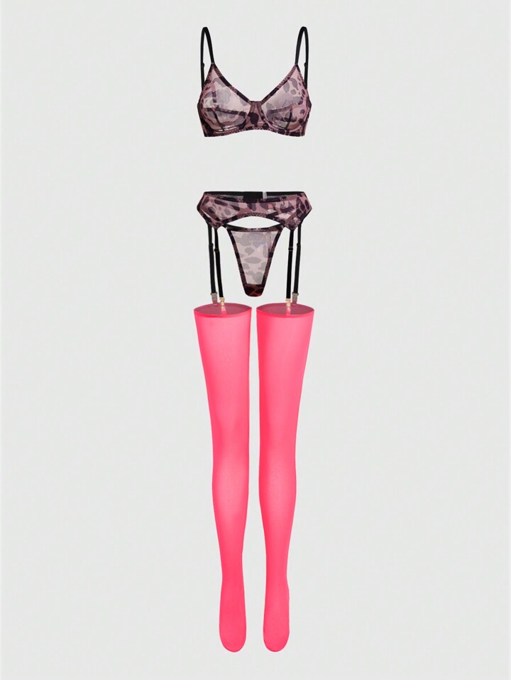 Conjunto De Lencería Sexy Con Top De Malla Estampado De Leopardo, Tanga Con Estampado Colorido Y Medias Transparentes
