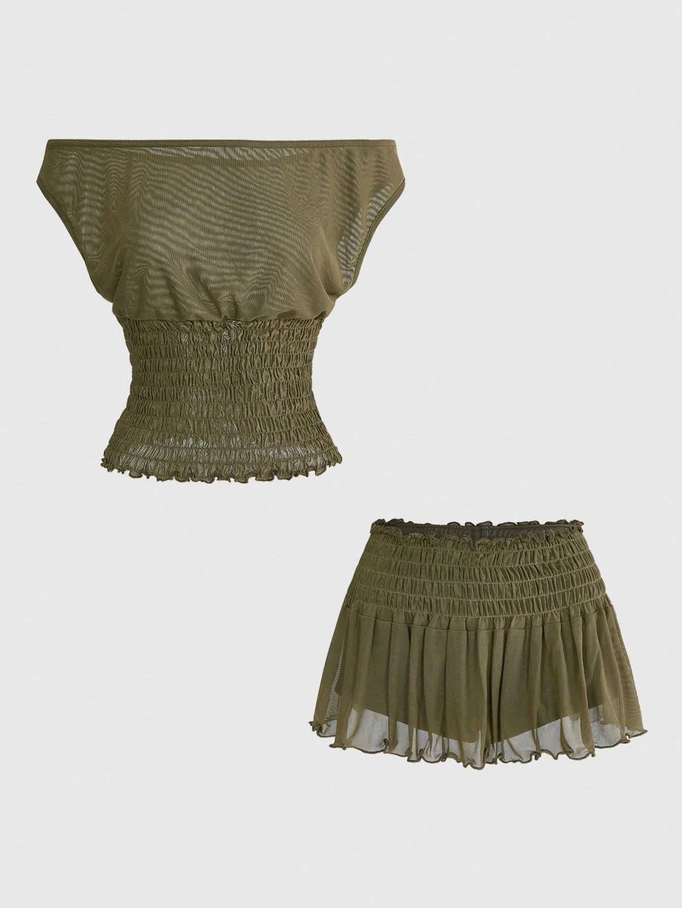 Conjunto de dos piezas con top corto y shorts en color verde militar sexy
