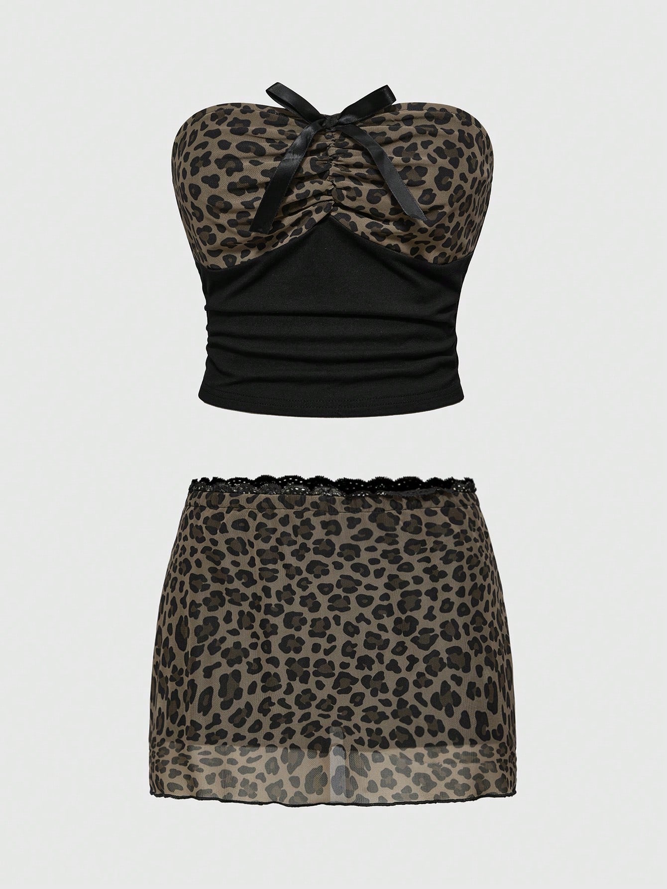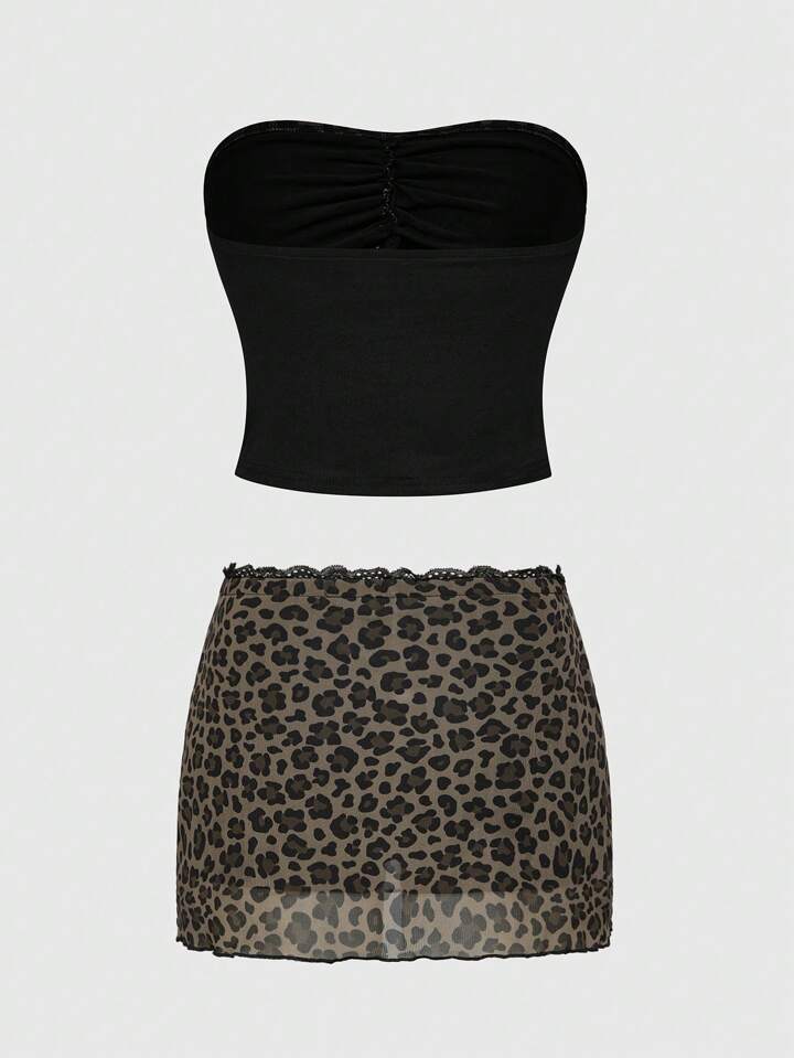 Conjunto de 2 piezas de top corto vintage sexy de malla con estampado de leopardo y falda ajustado estilo Shibuya Gyaru Y2K