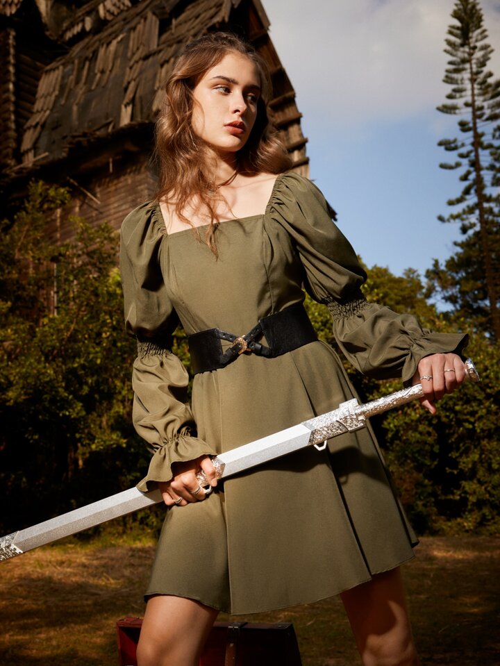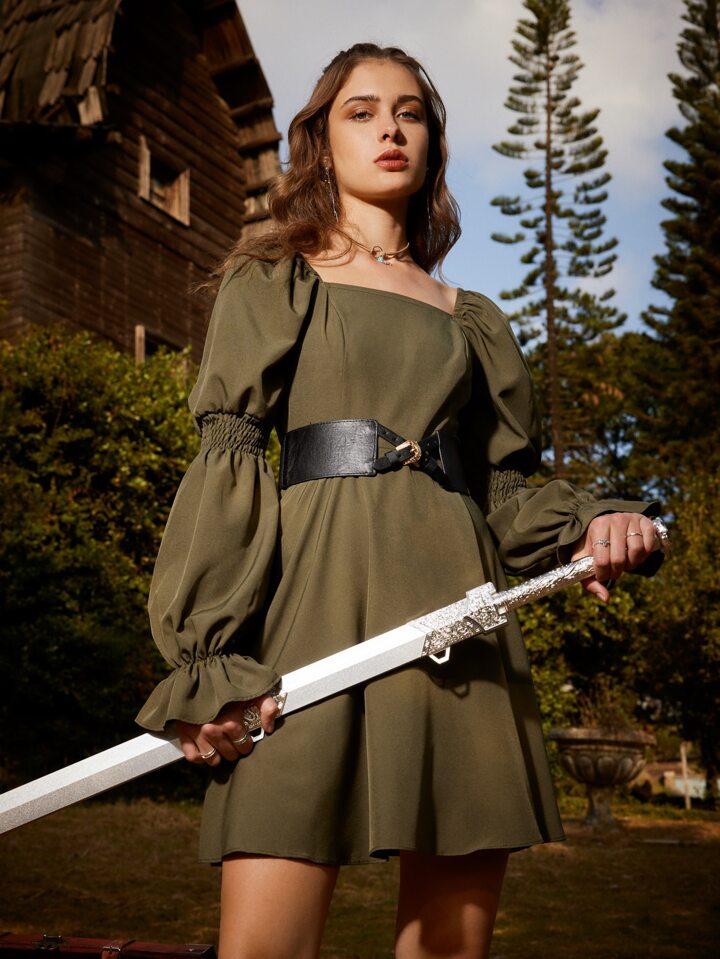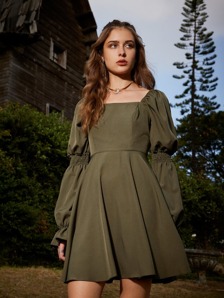 Vestido con fruncido de manga con volante de cuello cuadrado