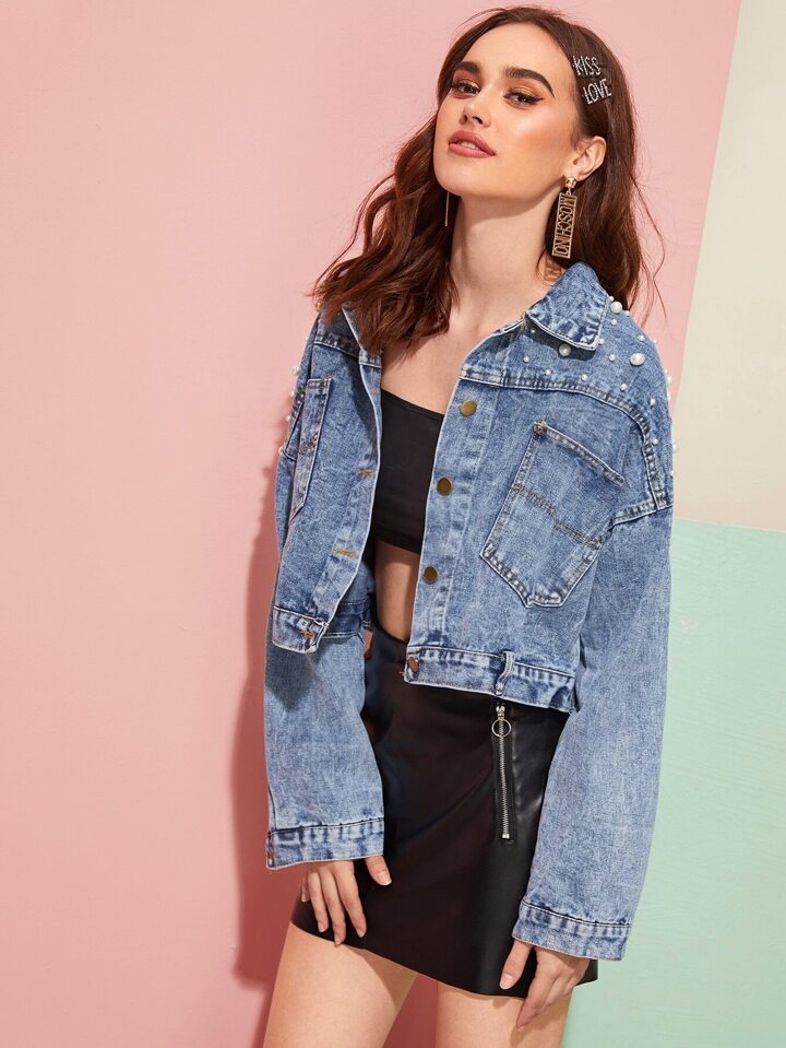 Cazadora mezclilla de hombros caídos con perlas con botón
