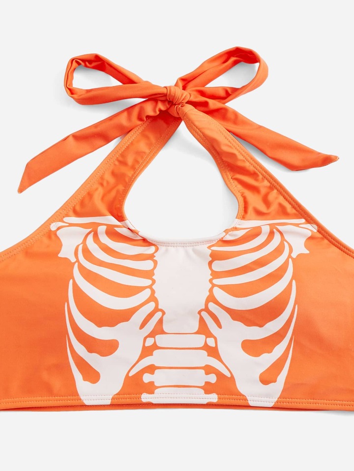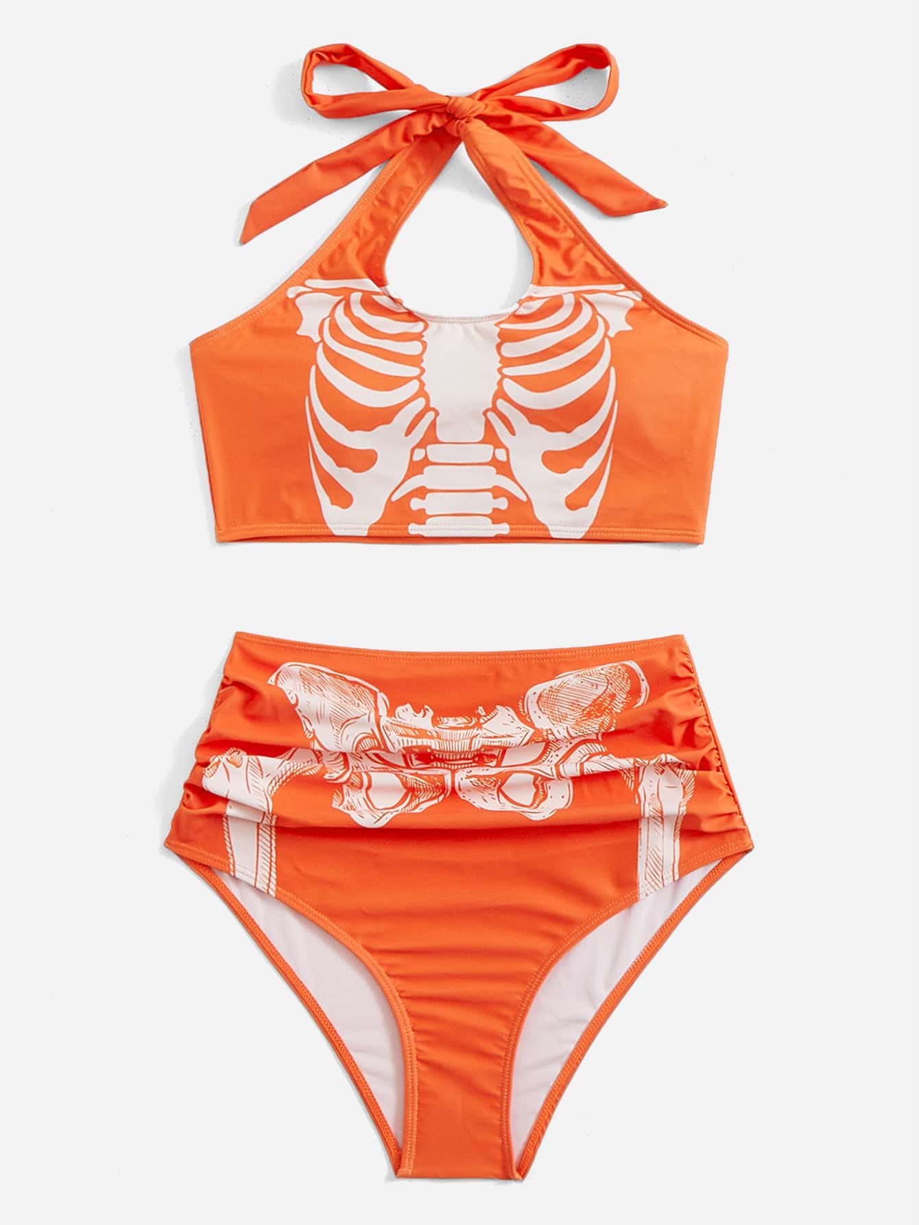 Conjunto de bikini gráfico de esqueleto con escote de halter para playa de verano