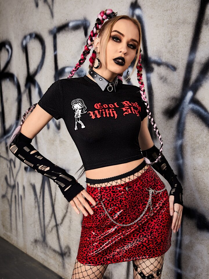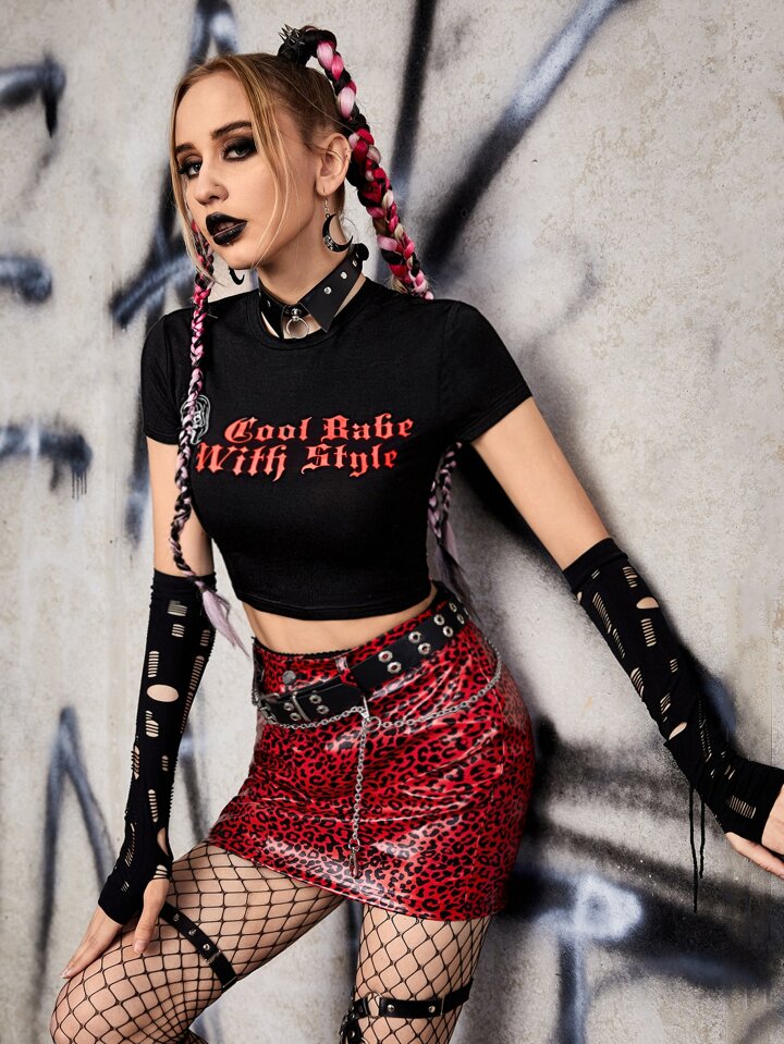 con estampado de slogan Camiseta crop & con estampado de leopardo con diseño de cadena Falda sin cinturón