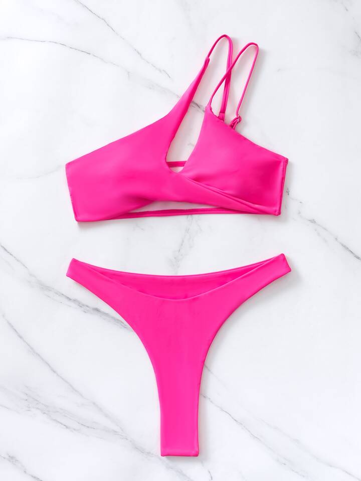Conjunto de bikini sólido, sujetador de un hombro recortado y Bottom de corte alto, 2 piezas, bikini de verano y playa