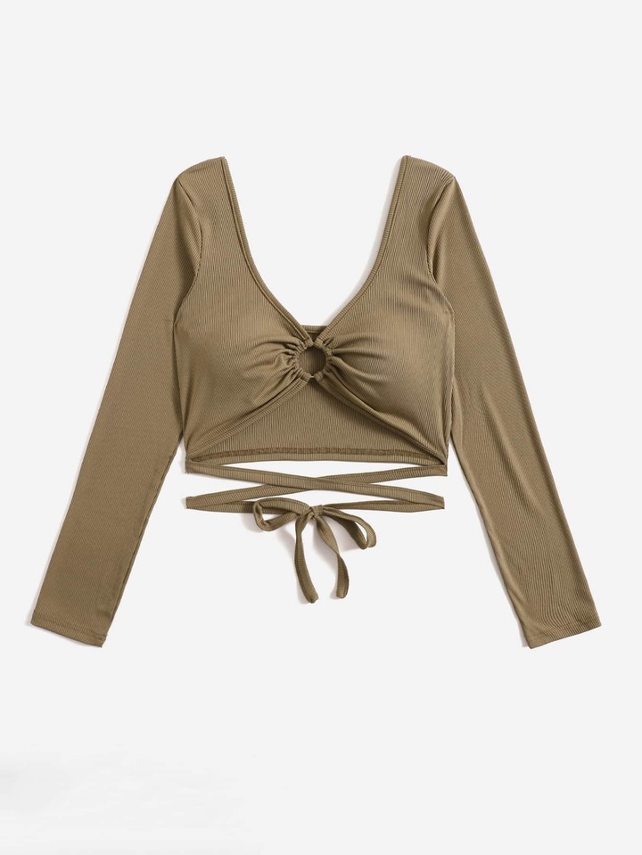 Top corto unicolor con tira cruzada con diseño de aro