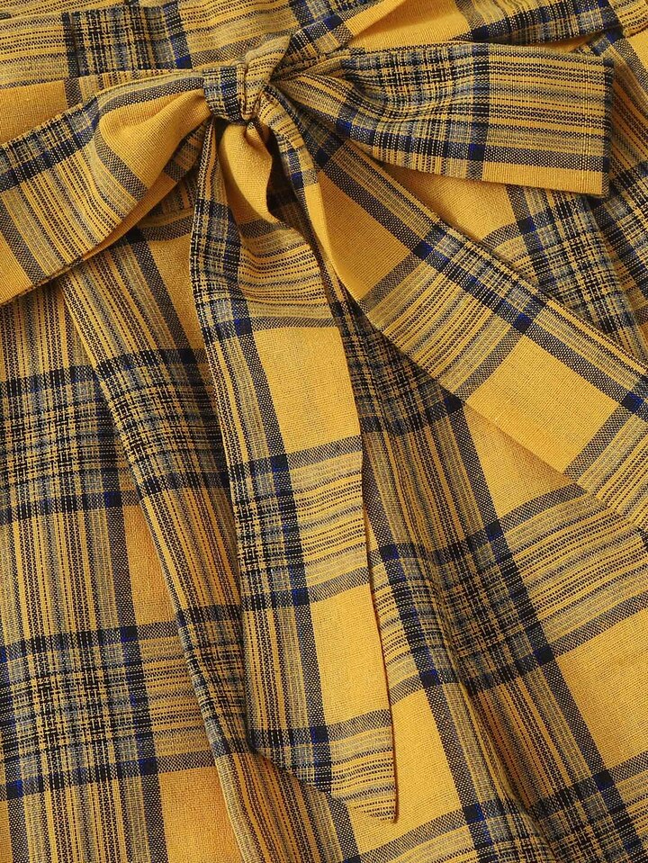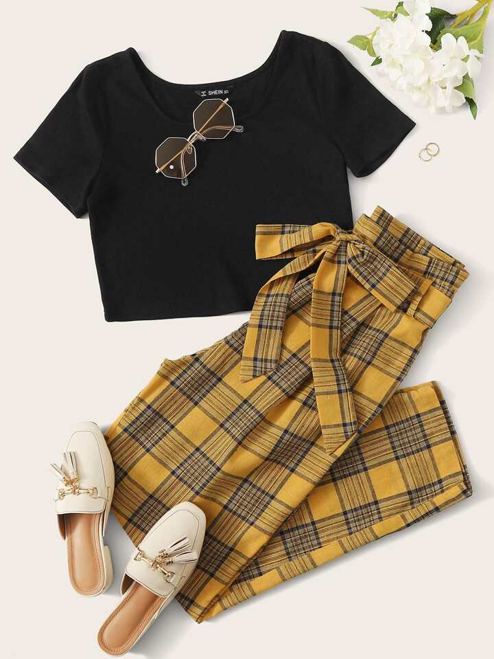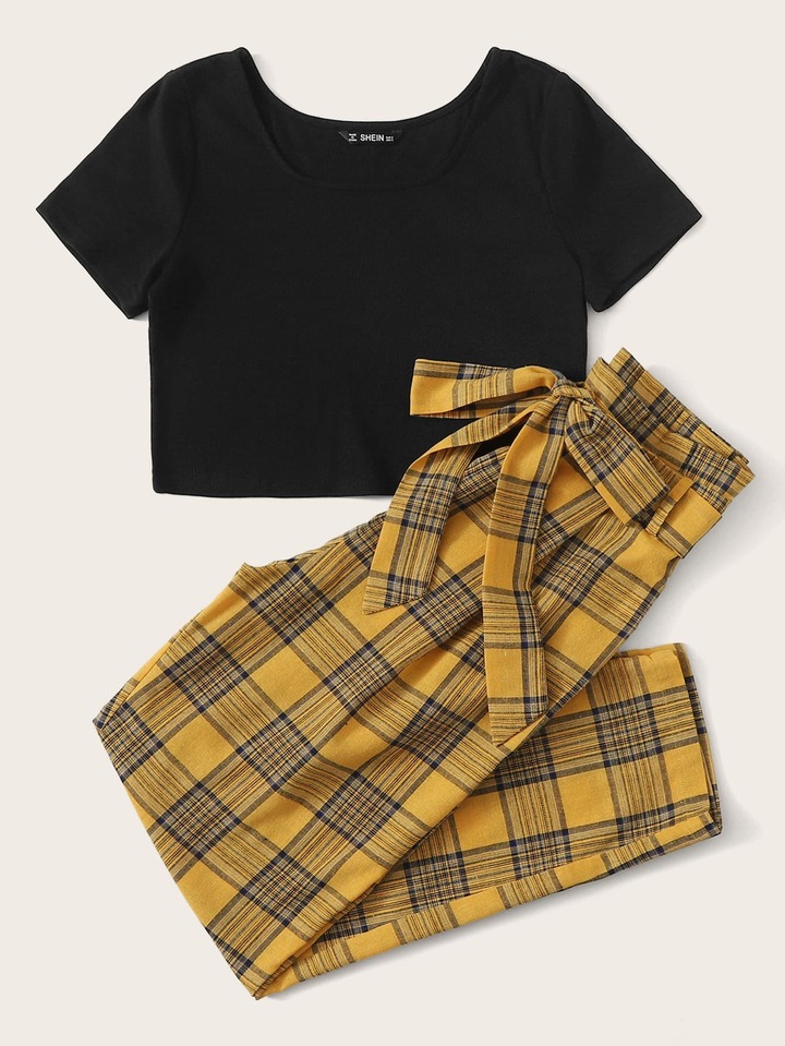 Conjunto top corto unicolor con pantalones con cinturón de tartán