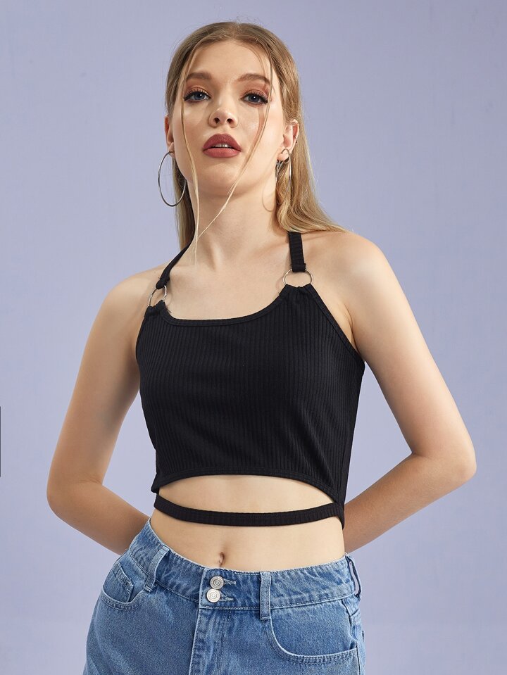 Top De Cuello Halter Decorativo Con Recorte Sólido Y Decoración Anular