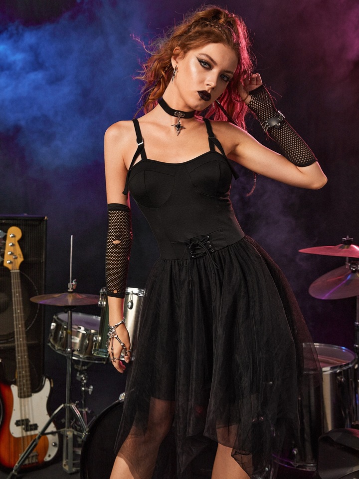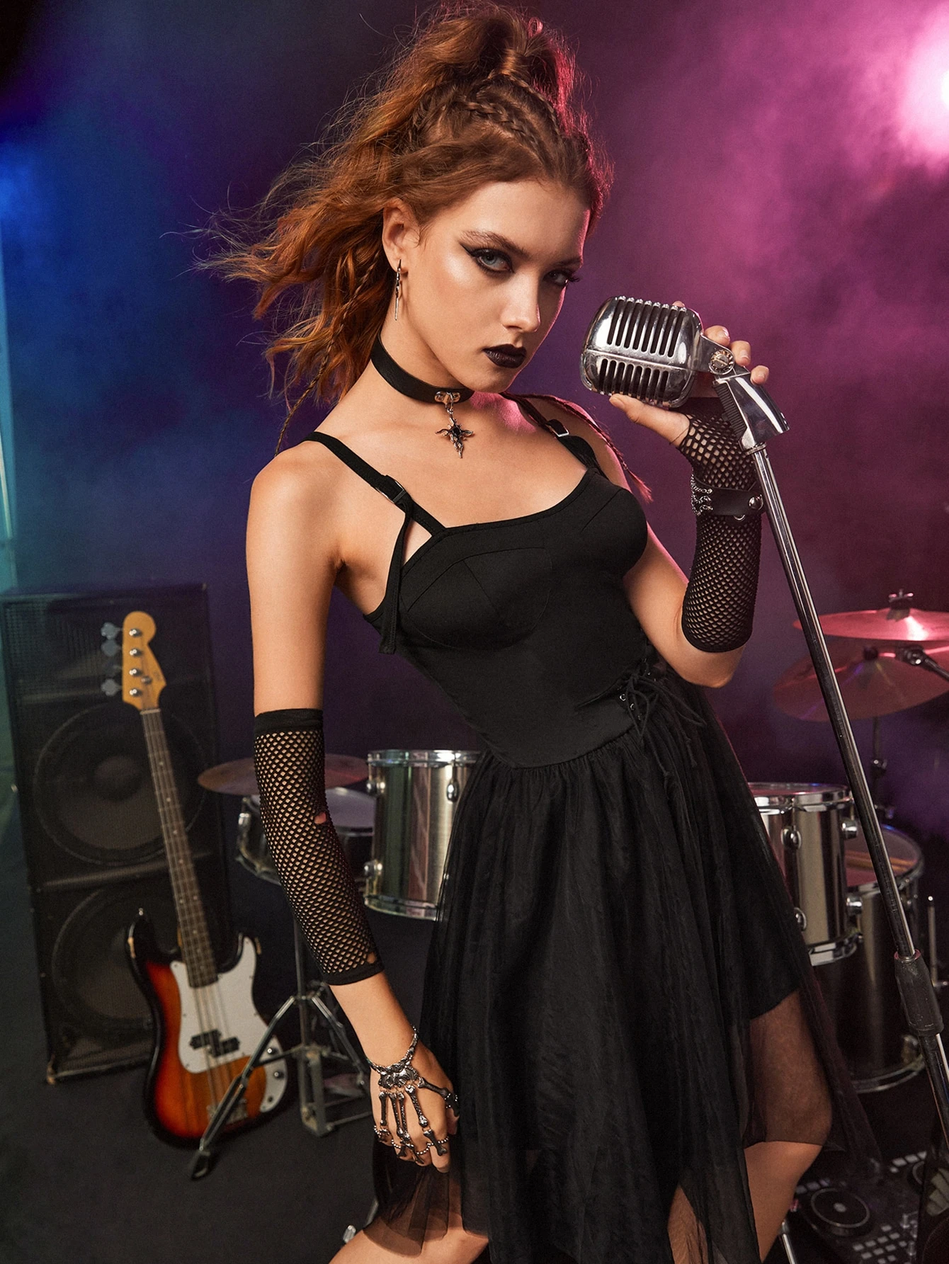 Vestido de tirantes unicolor con cordón de malla en contraste