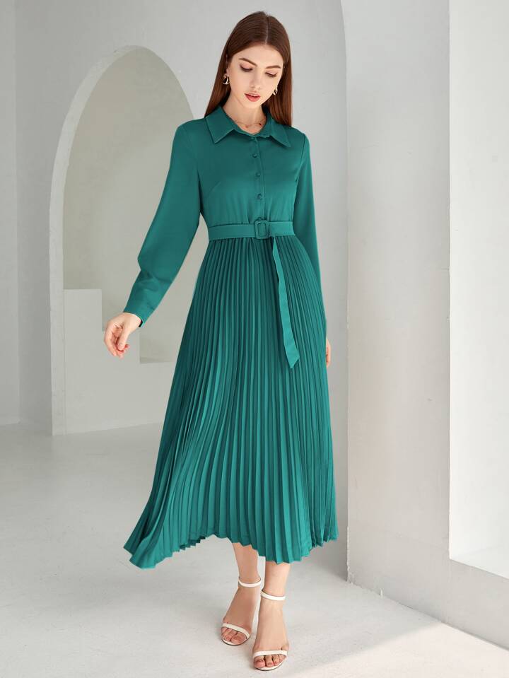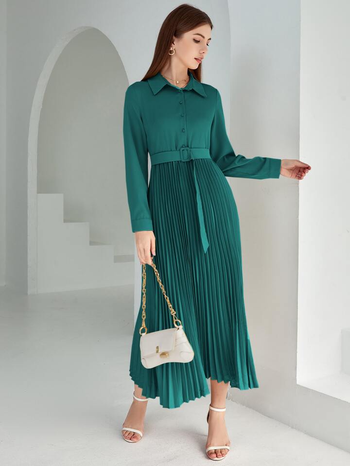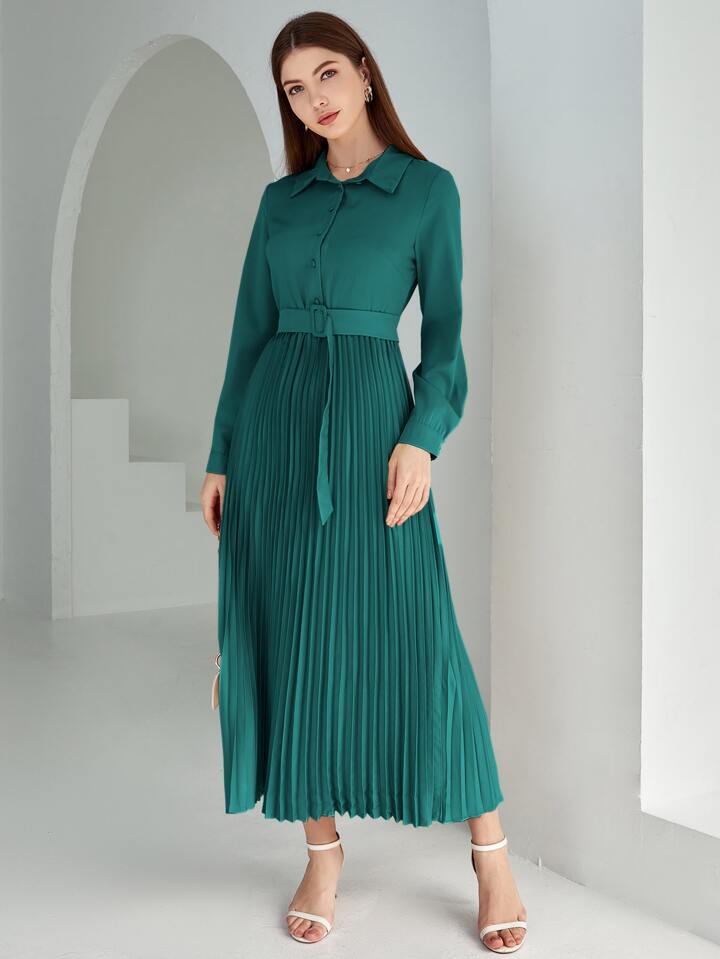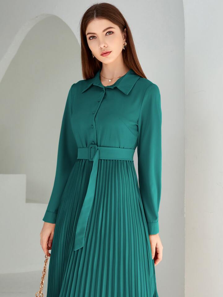Vestido camisa con cinturón bajo con fruncido unicolor