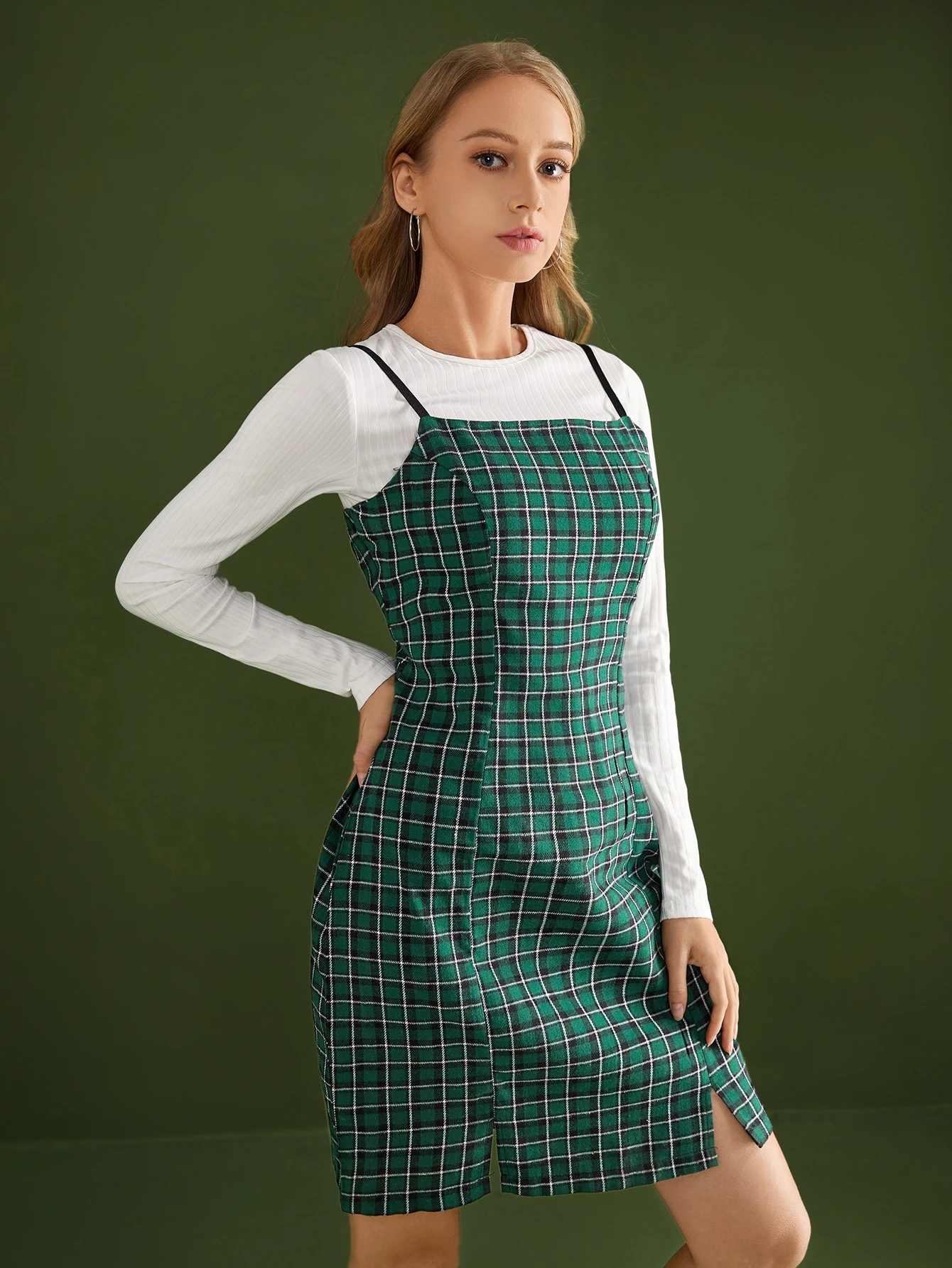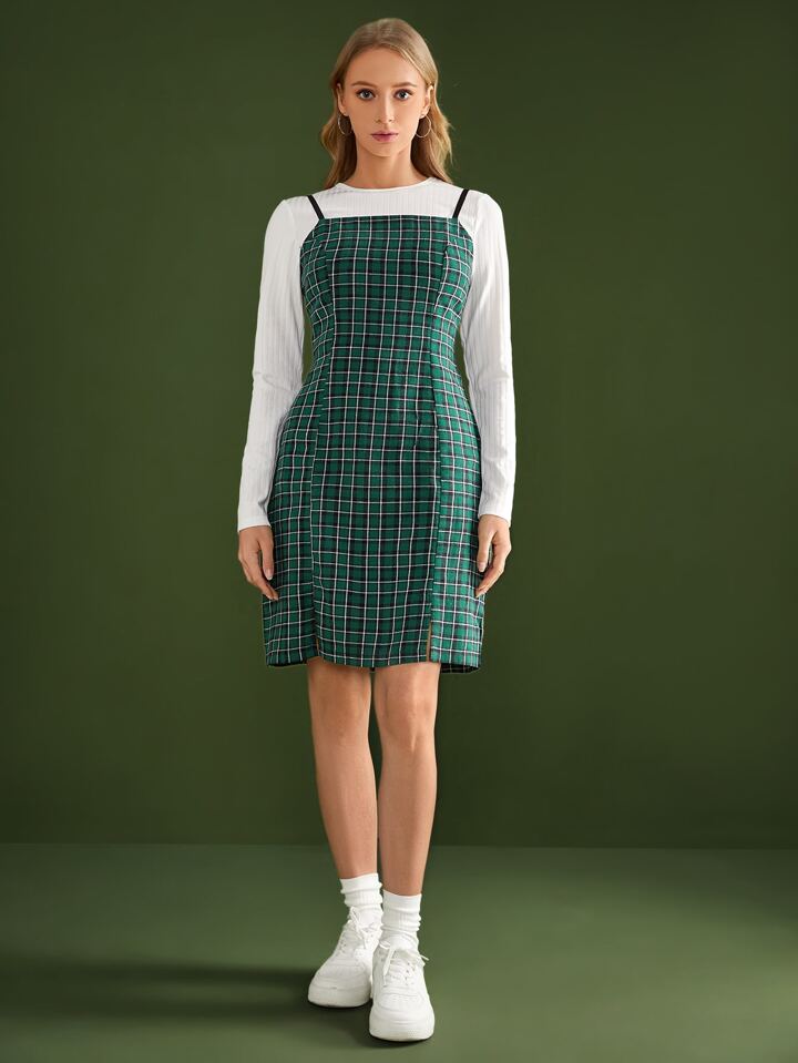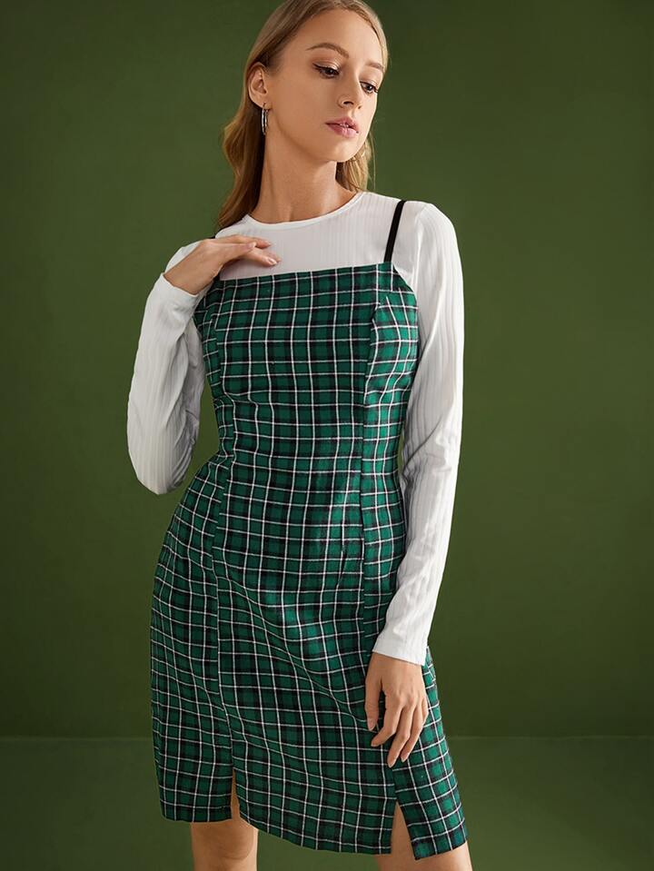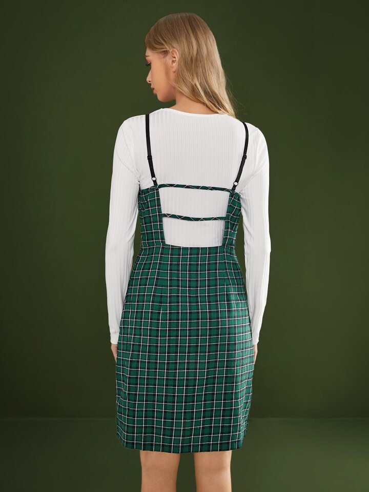 unicolor de canalé Camiseta corta & de cuadros Vestido de tirantes