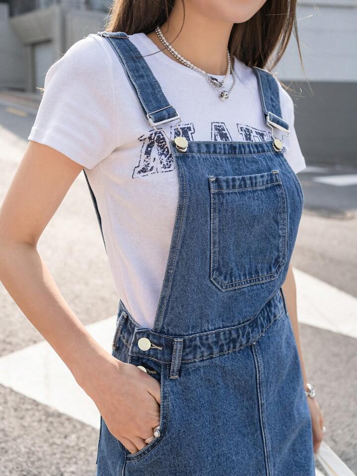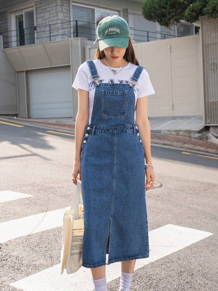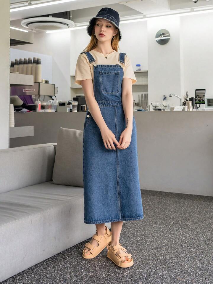 Vestido de mezclilla de tirantes de frente dividido de unicolor