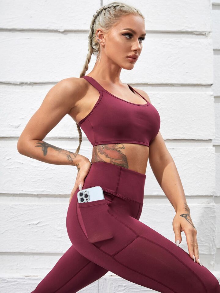 Sujetador deportivo unicolor con leggings con bolsillo de móvil