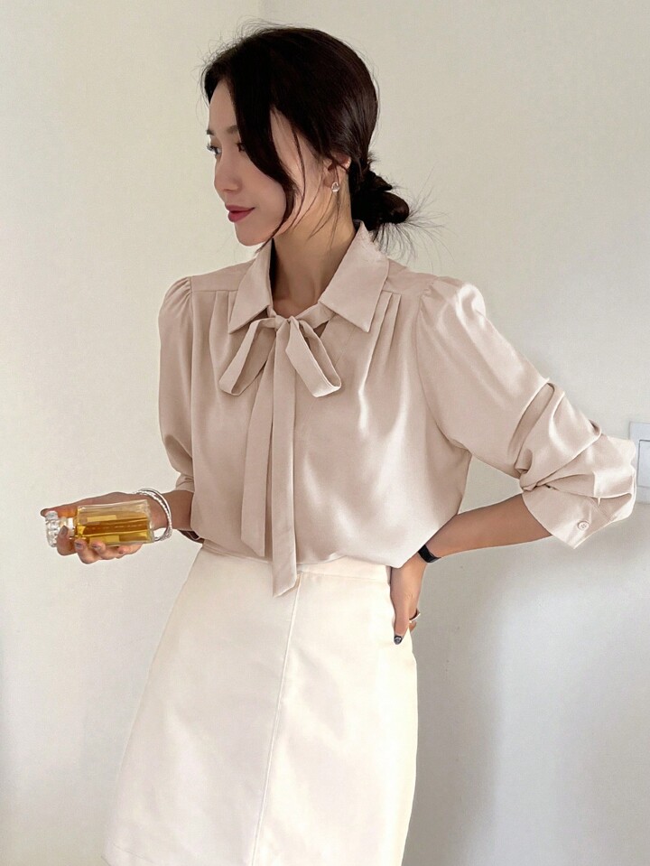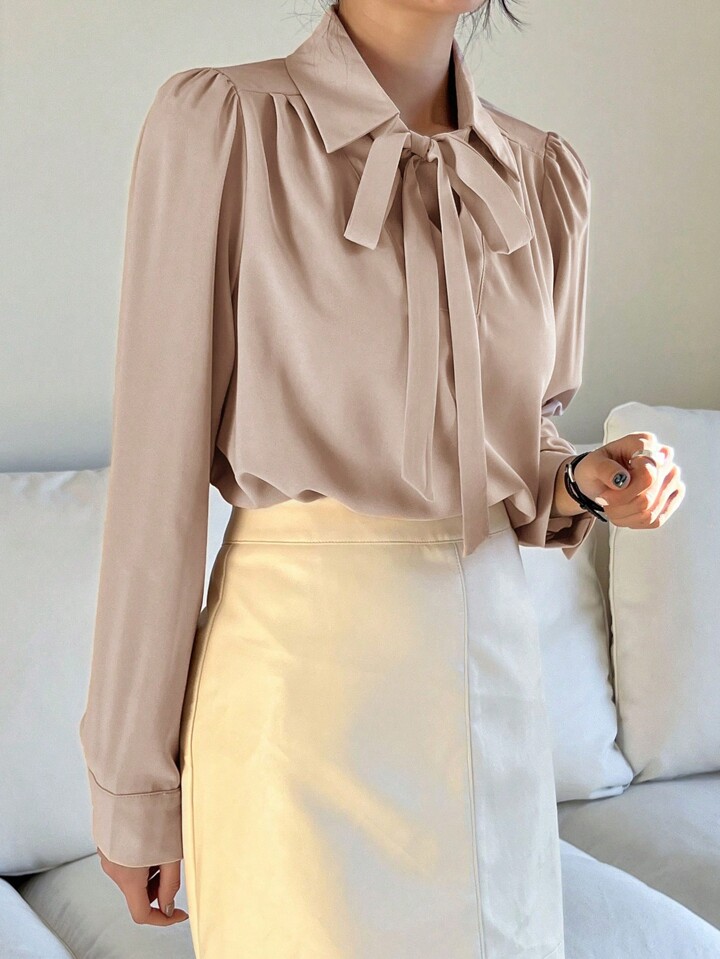 Blusa de manga larga con cuello de corbata y mangas abullonadas