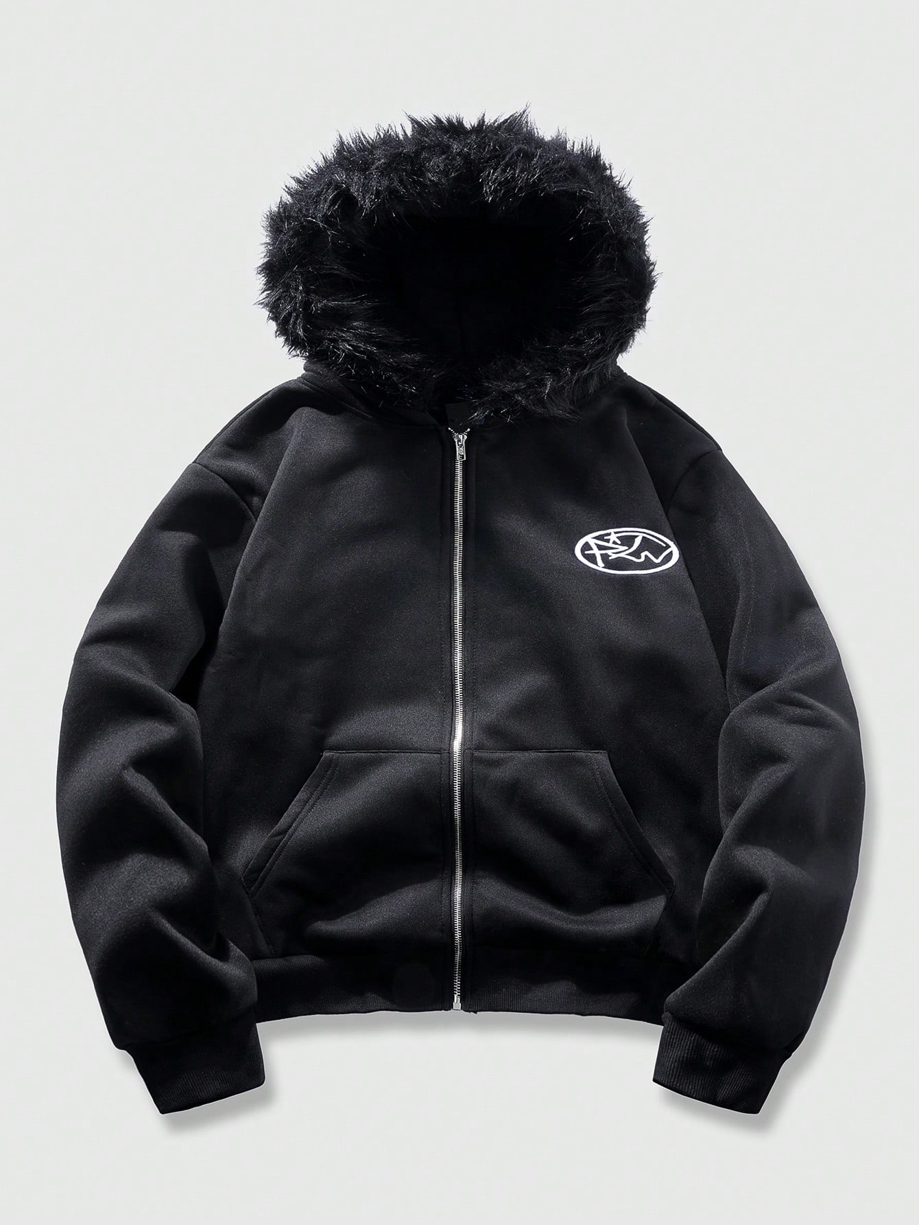 Casual Sudadera con capucha con cremallera y bordado para hombre, de manga larga, para otoño/invierno, con cuello de piel