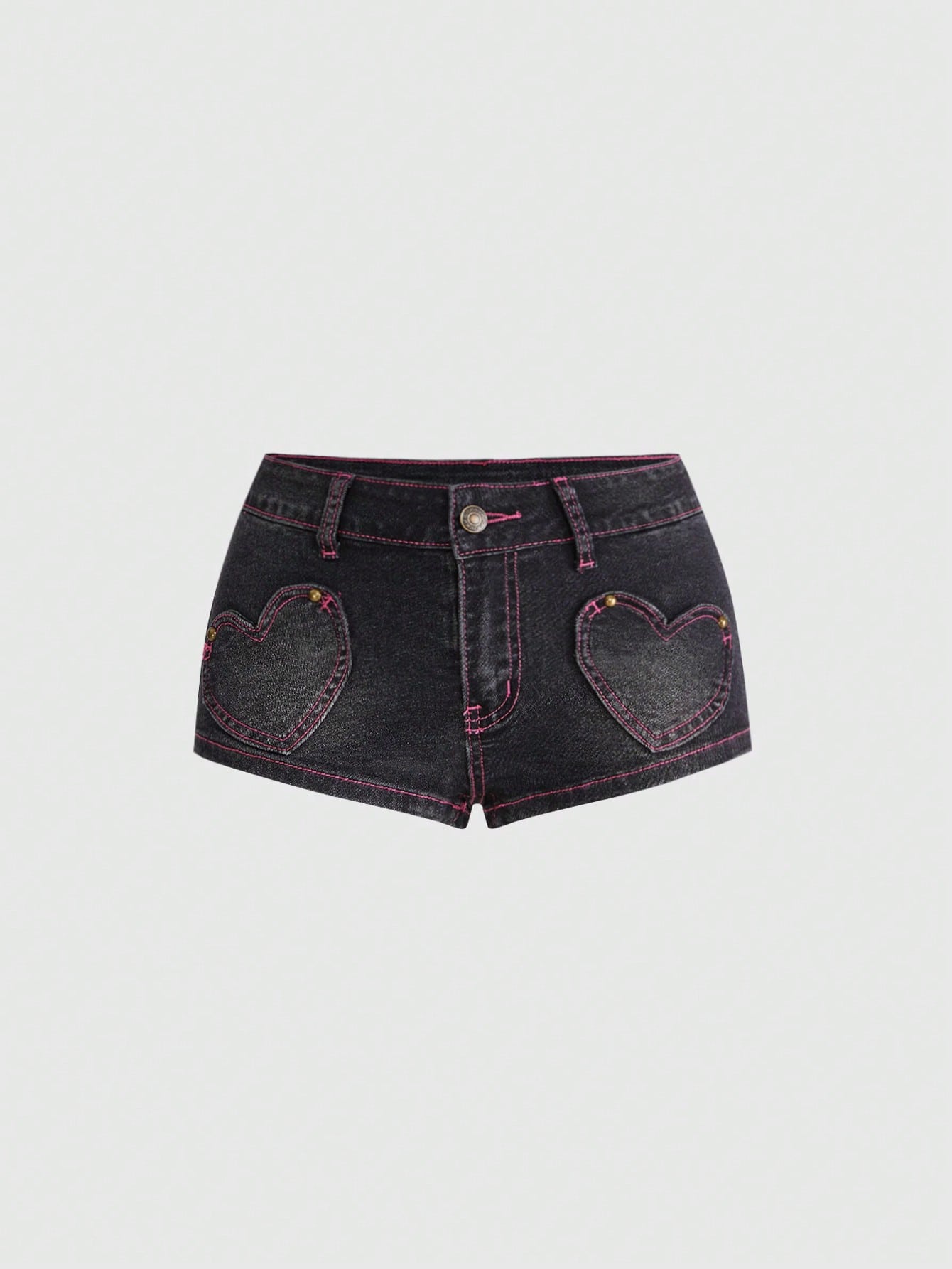 Shorts vaqueros de cintura súper baja con parche en forma de corazón y decoración de remaches, estilo retro Y2K contraste de color para mujer