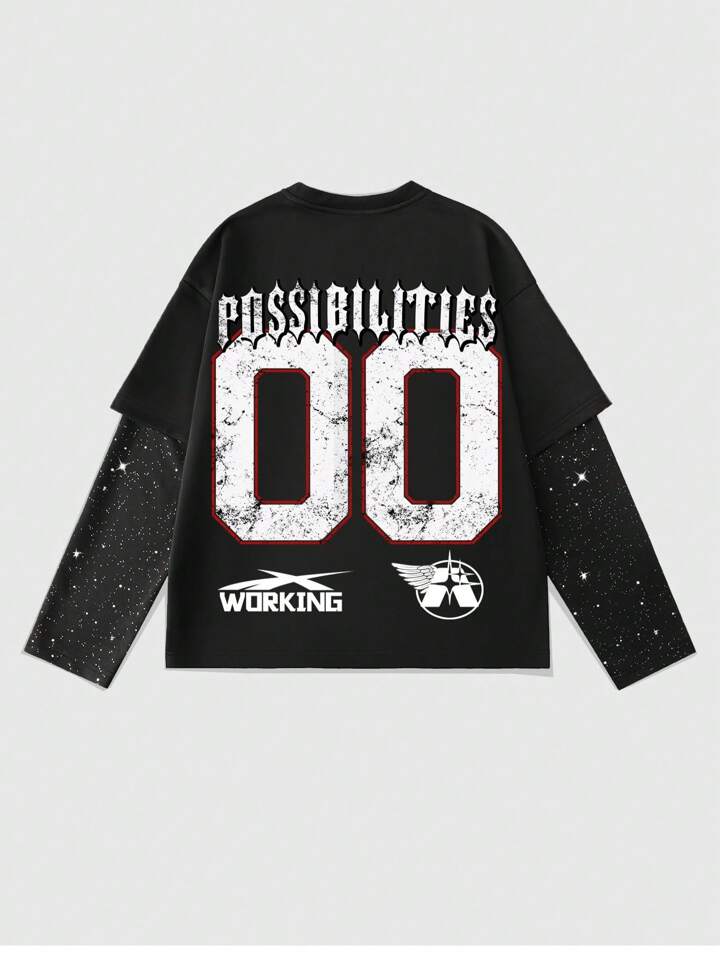 Street Life 1 pieza Camiseta de manga larga holgada para hombres, 2 en 1, estilo callejero retro