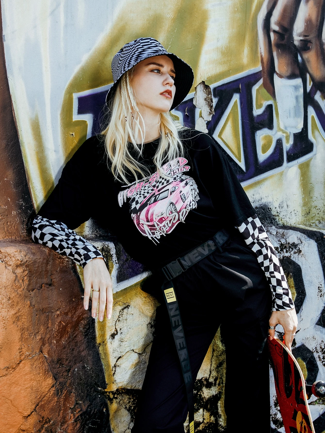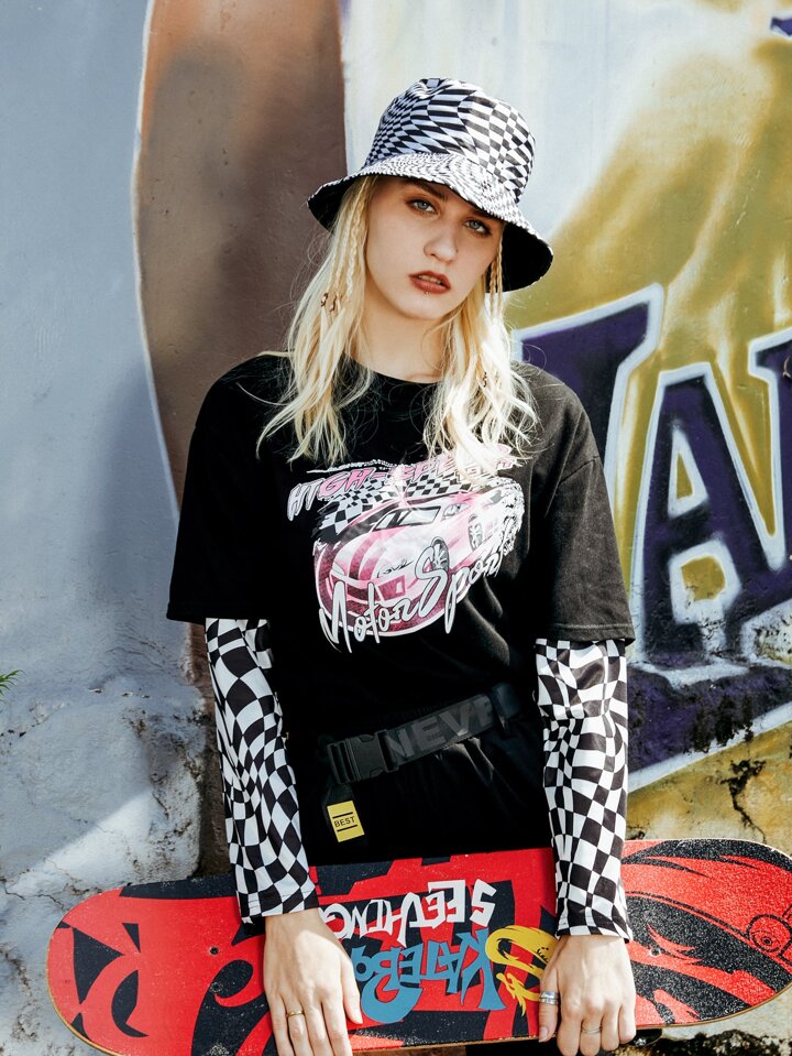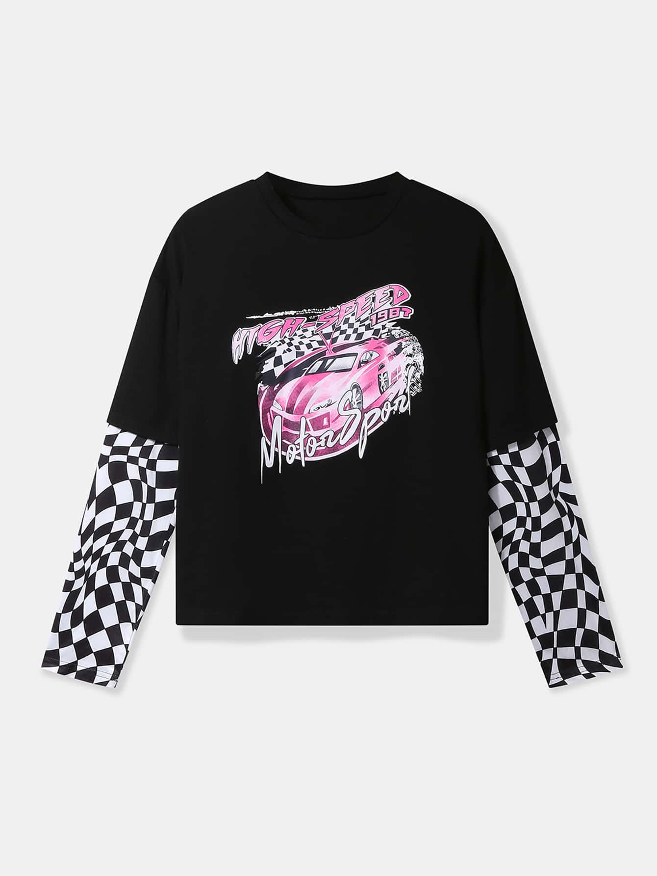 Street Life Camiseta corta 2 en 1 de cuadros de manga con letra con estampado de coche