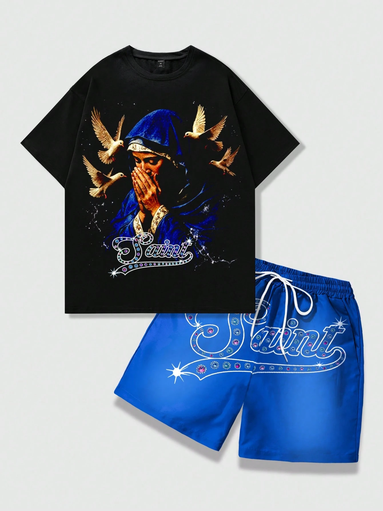 Street Life Set de 2 piezas de camiseta de manga corta con gráfico de retrato masculino y shorts, apto para uso diario, primavera/verano