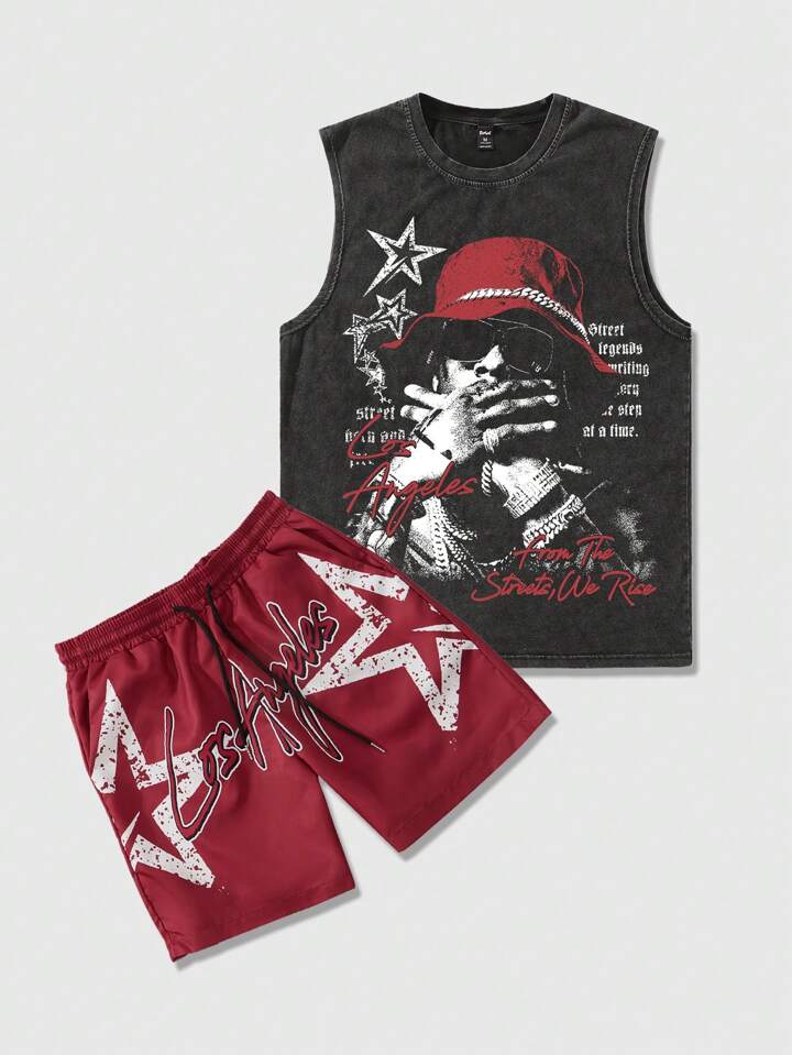 Street Life Set de 2 piezas que incluye top sin mangas con estampado de retrato masculino y shorts para un atuendo casual, apto para primavera y verano