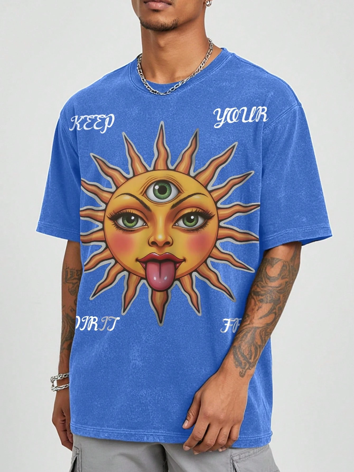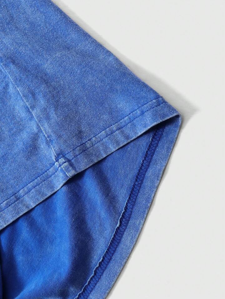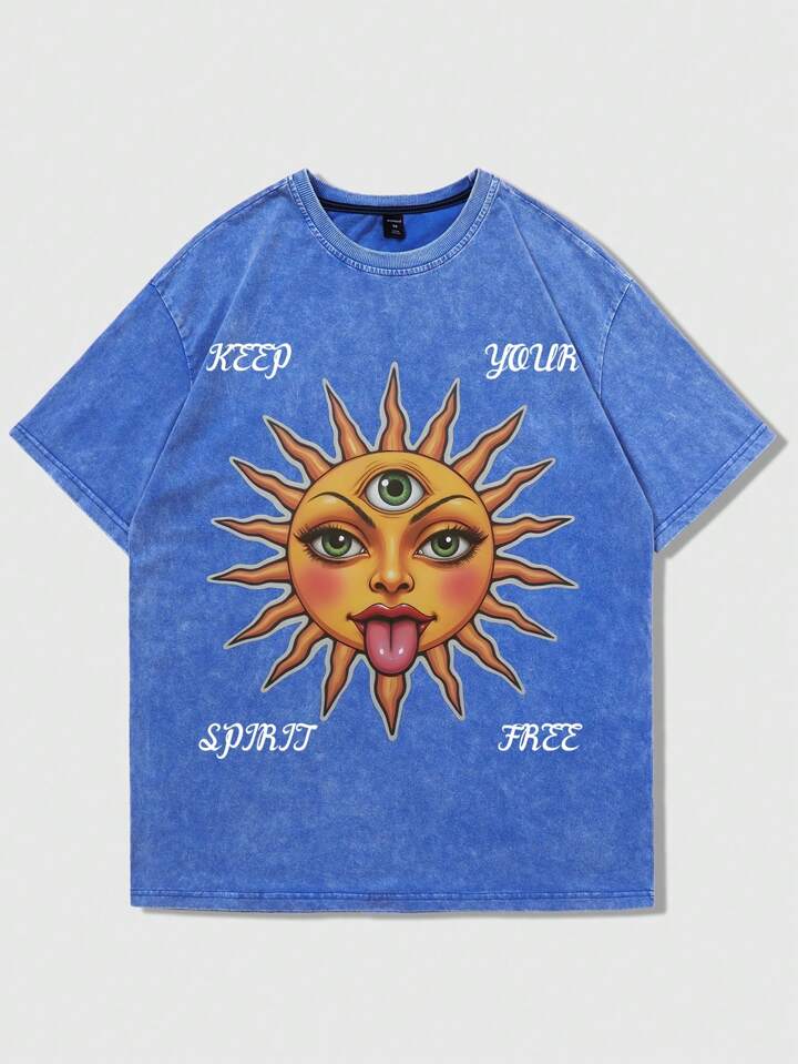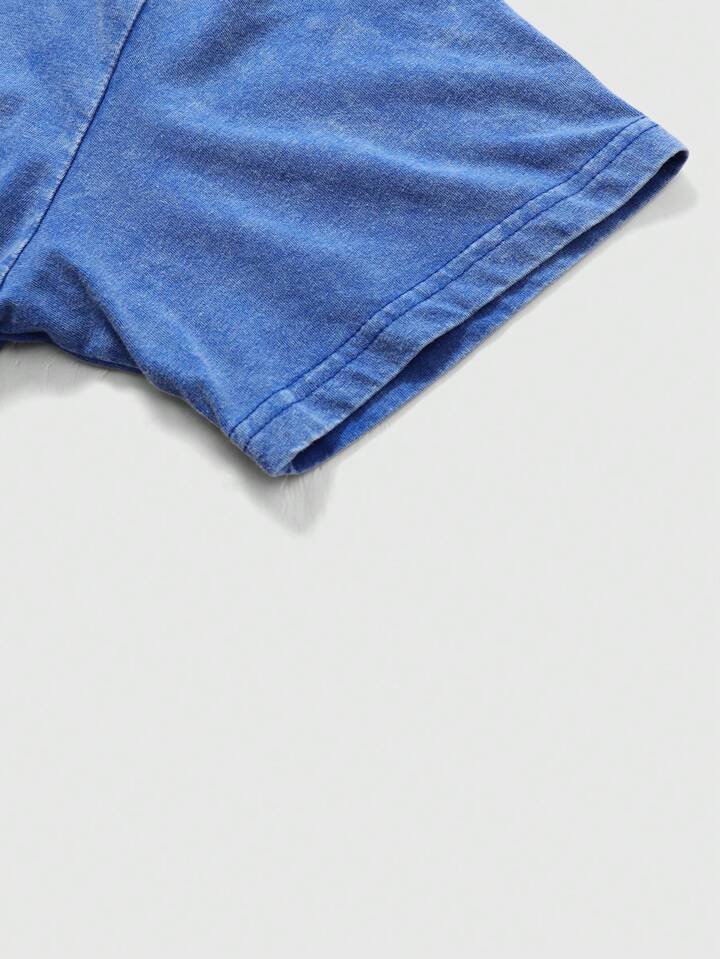 Street Life Camiseta casual de moda azul desgastado, con diseño gráfico de dibujos animados vibrantes. En general, un estilo relajado y juguetón, adecuado para usar en días de verano casuales.