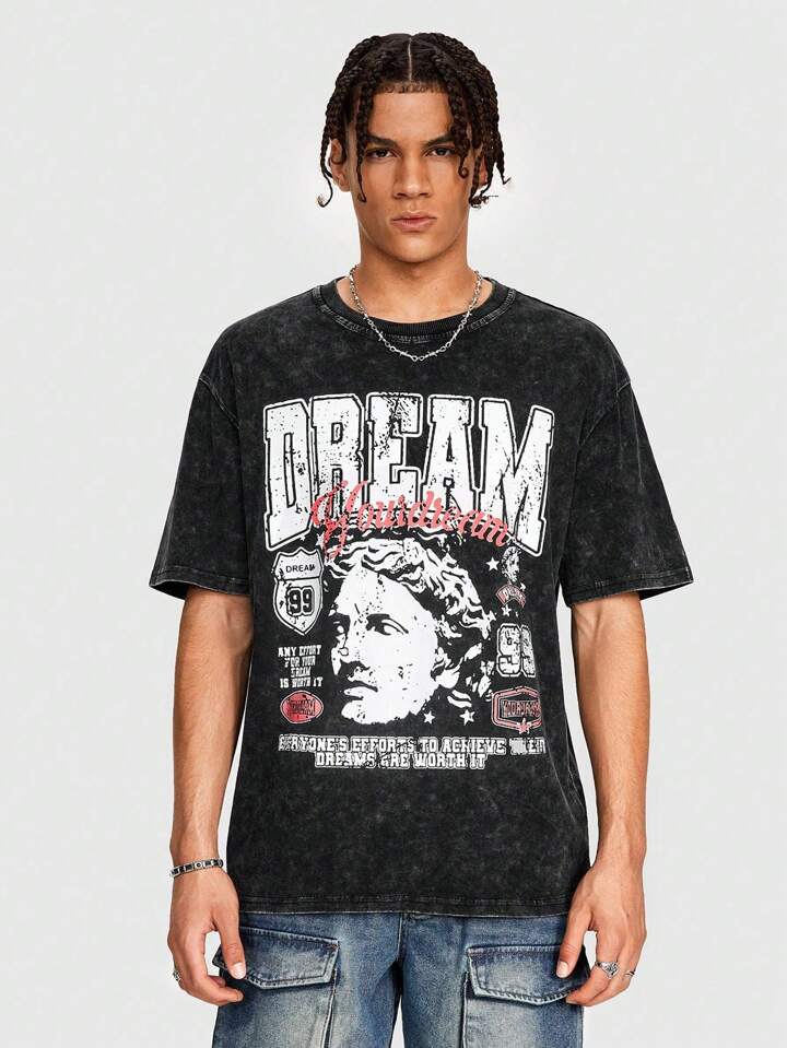 Street Life Camiseta de manga corta holgada para hombres con estampado de letras universitarias desgastado