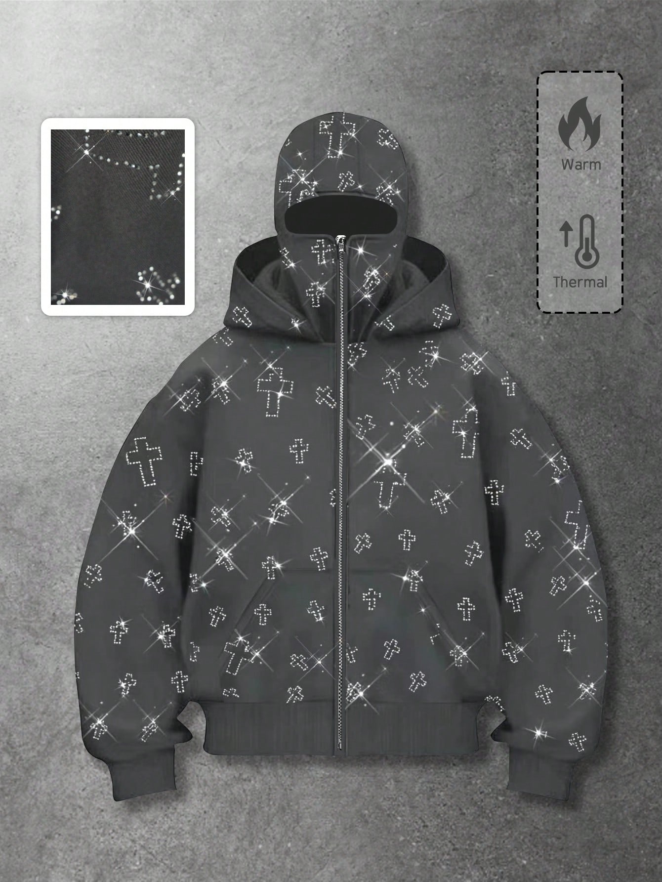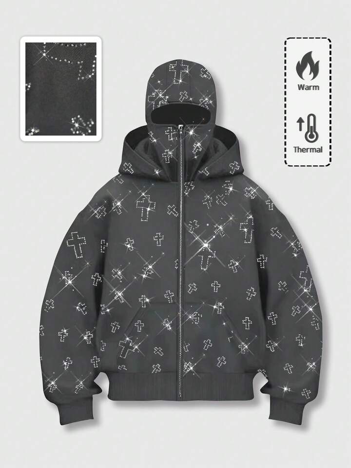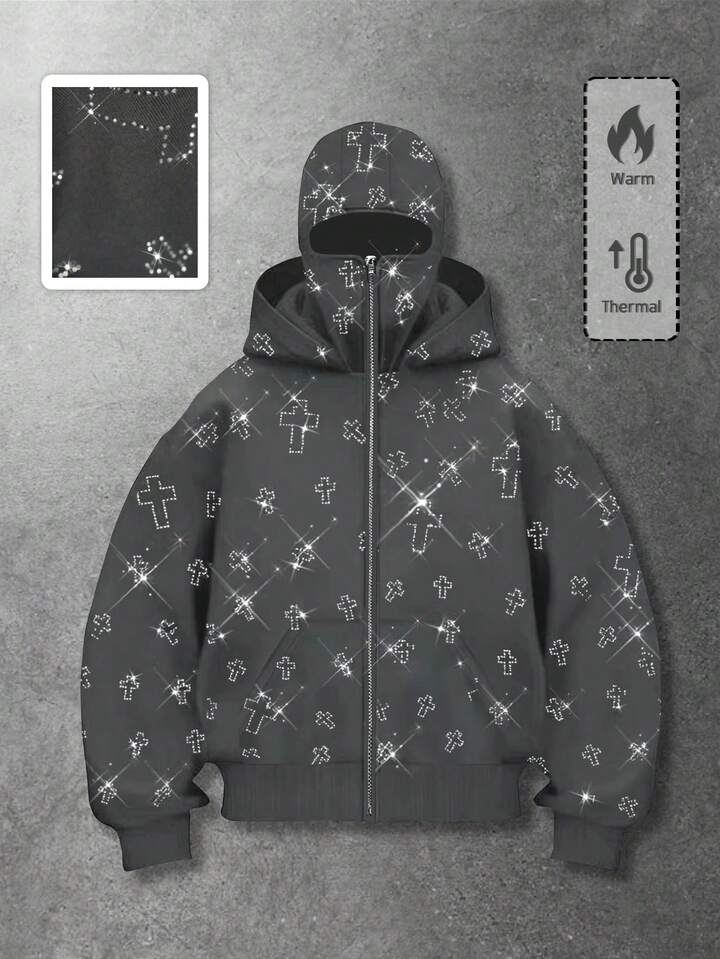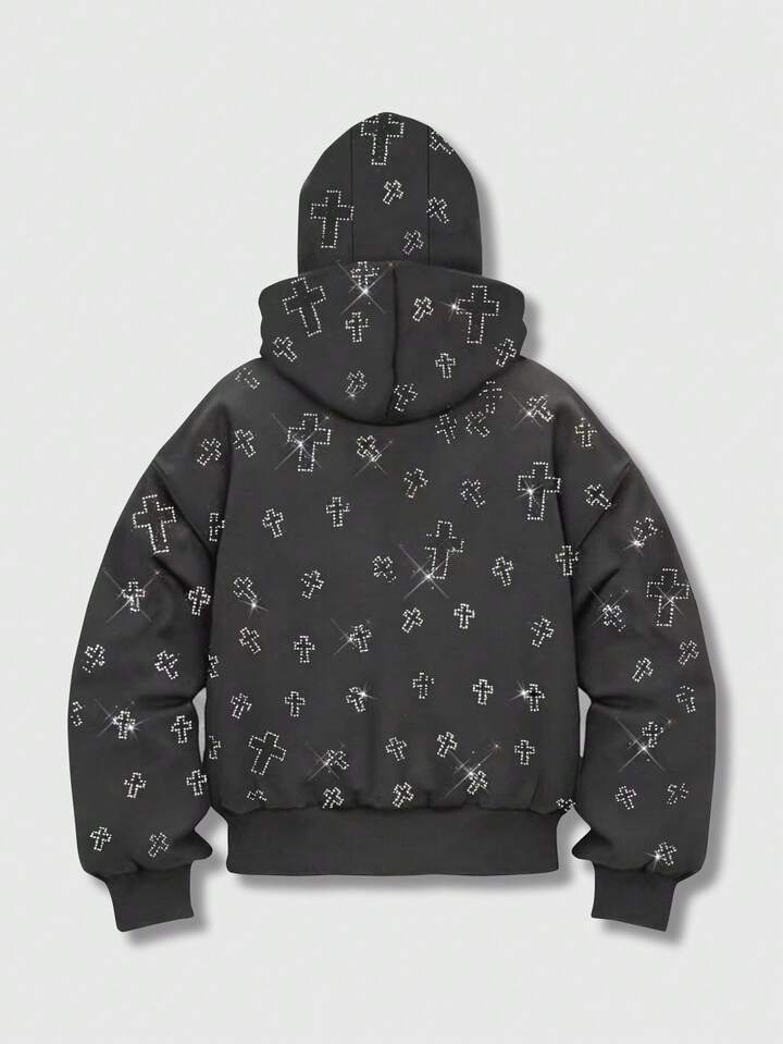 Street Life Sudadera con capucha con bolsillos y adornos de strass con cremallera delantera, sudadera con capucha de moda para hombres