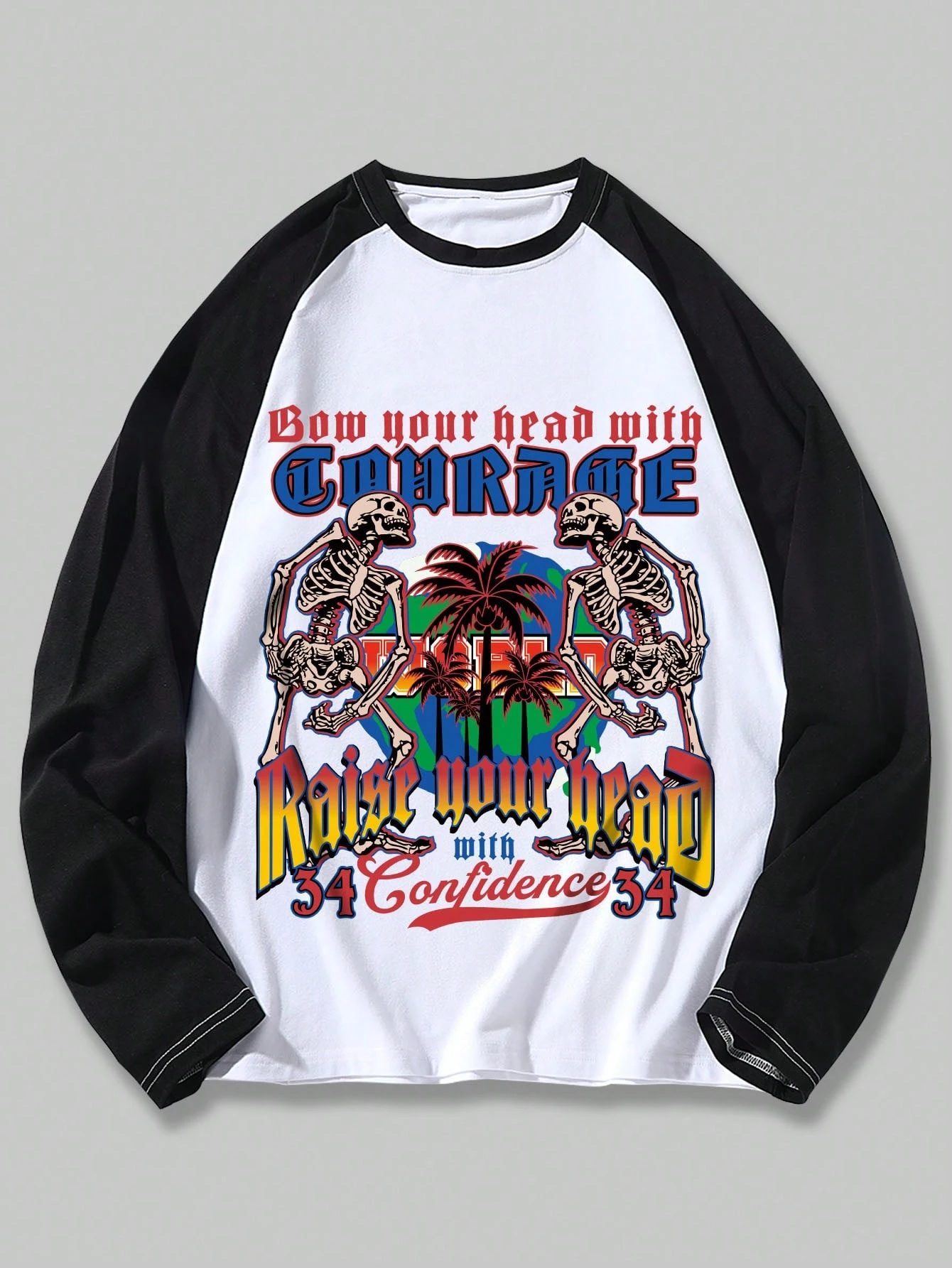 Street Life Hombres Camiseta con estampado de letra y esqueleto de manga raglán