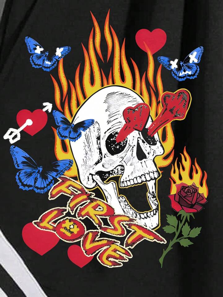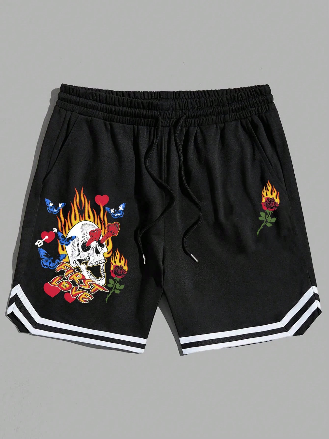 Street Life Hombres Shorts con estampado floral con cráneo ribete de rayas de cintura con cordón