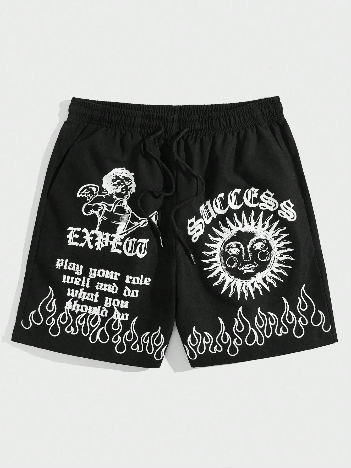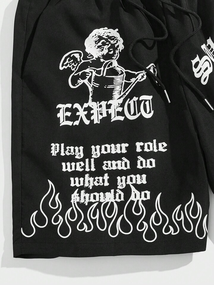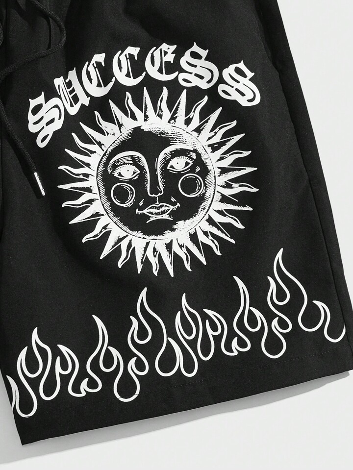 Street Life Hombres Shorts con slogan & con estampado de fuego de cintura con cordón