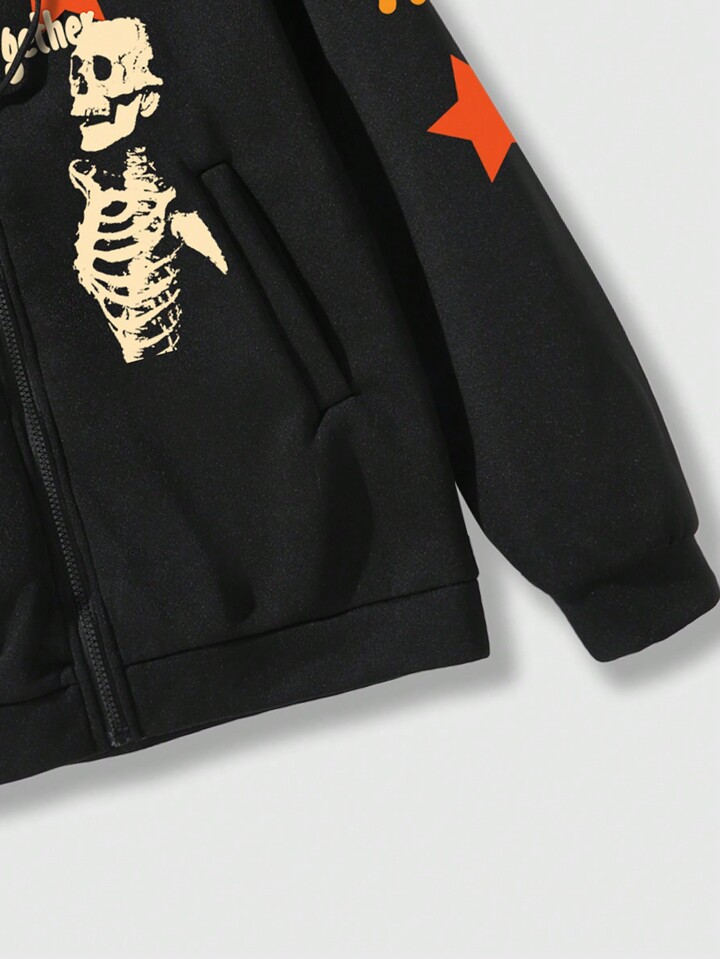 Street Life Hombres Capucha con slogan & estampado de esqueleto con cremallera con cordón