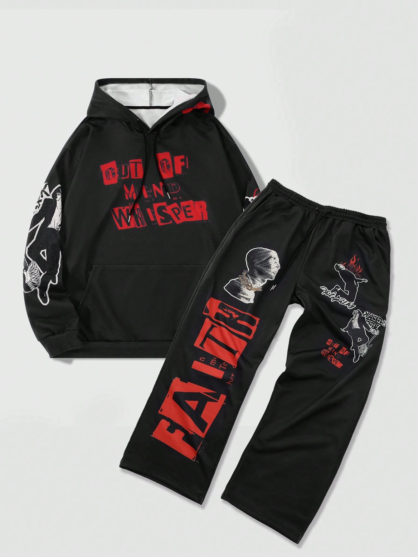 Street Life Conjunto casual de 2 piezas para hombre: sudadera con capucha y pantalón de chándal con estampado de eslogan para otoño