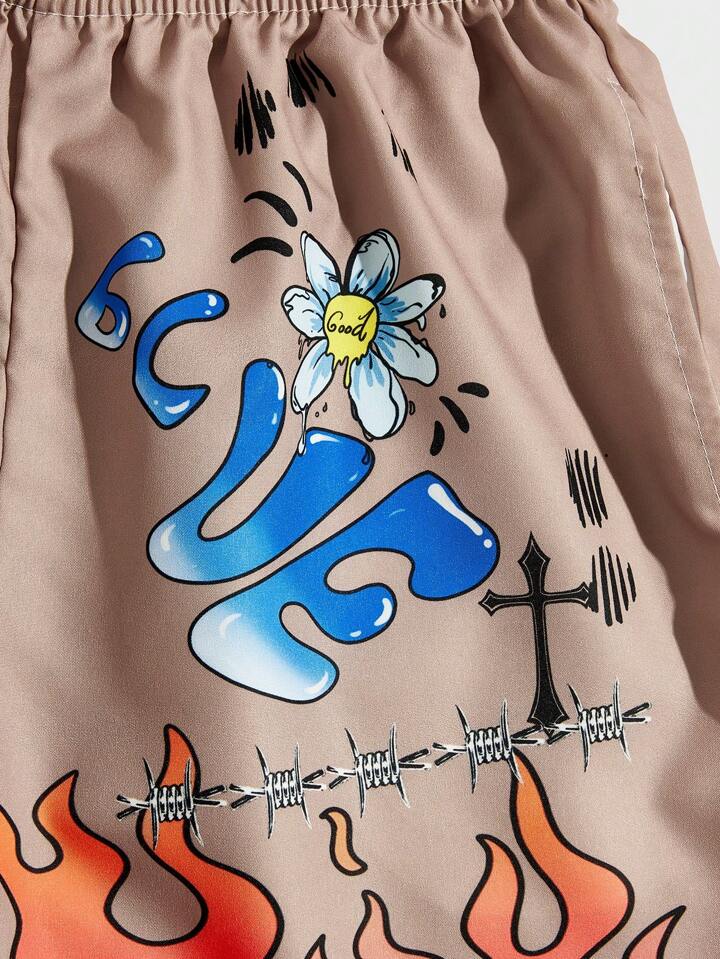 Street Life Pantalones cortos con cordón en la cintura con gráfico de flor y letra de fuego, para escuela