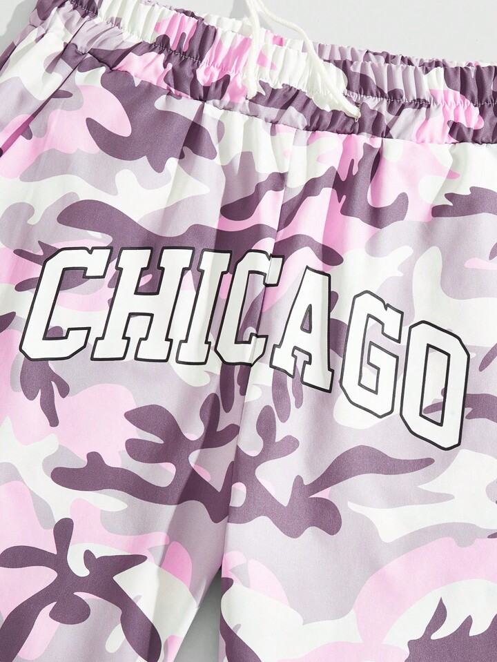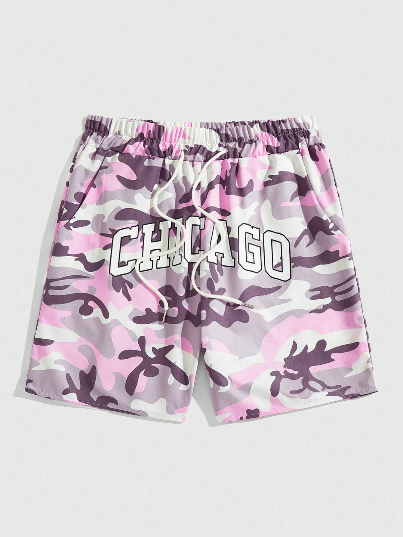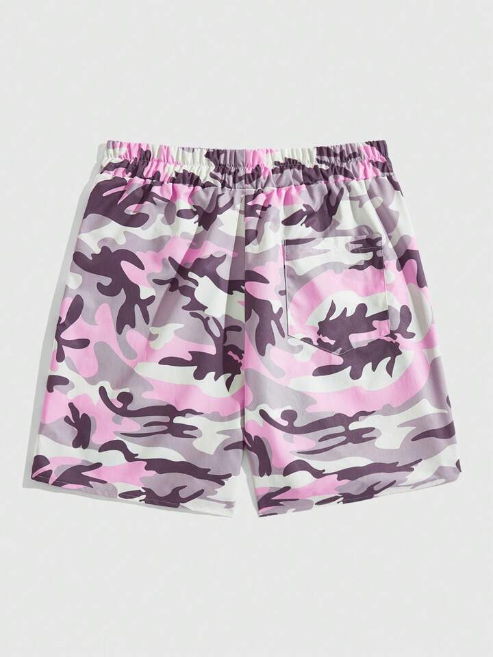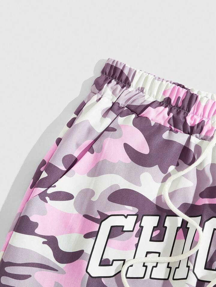 Street Life Pantalones cortos casuales para hombres con estampado camuflado, cintura con cordón, bolsillos en las caderas y letra impresa