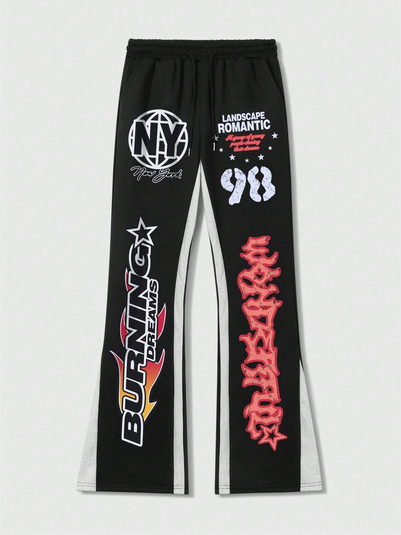 Street Life Pantalones de chándal acampanados de hombre con estampado de letras en contraste de colores patchwork, ropa de calle
