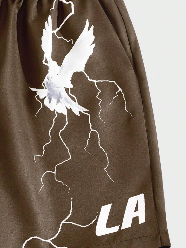 Street Life Pantalones cortos con cordón de cintura y gráfico de paloma y lema para hombres, escolar