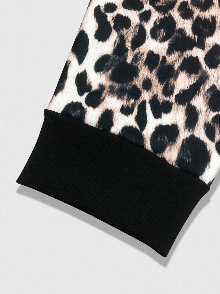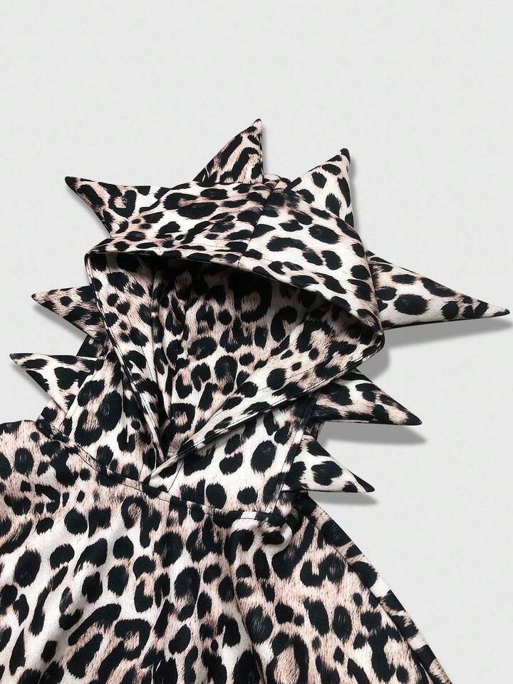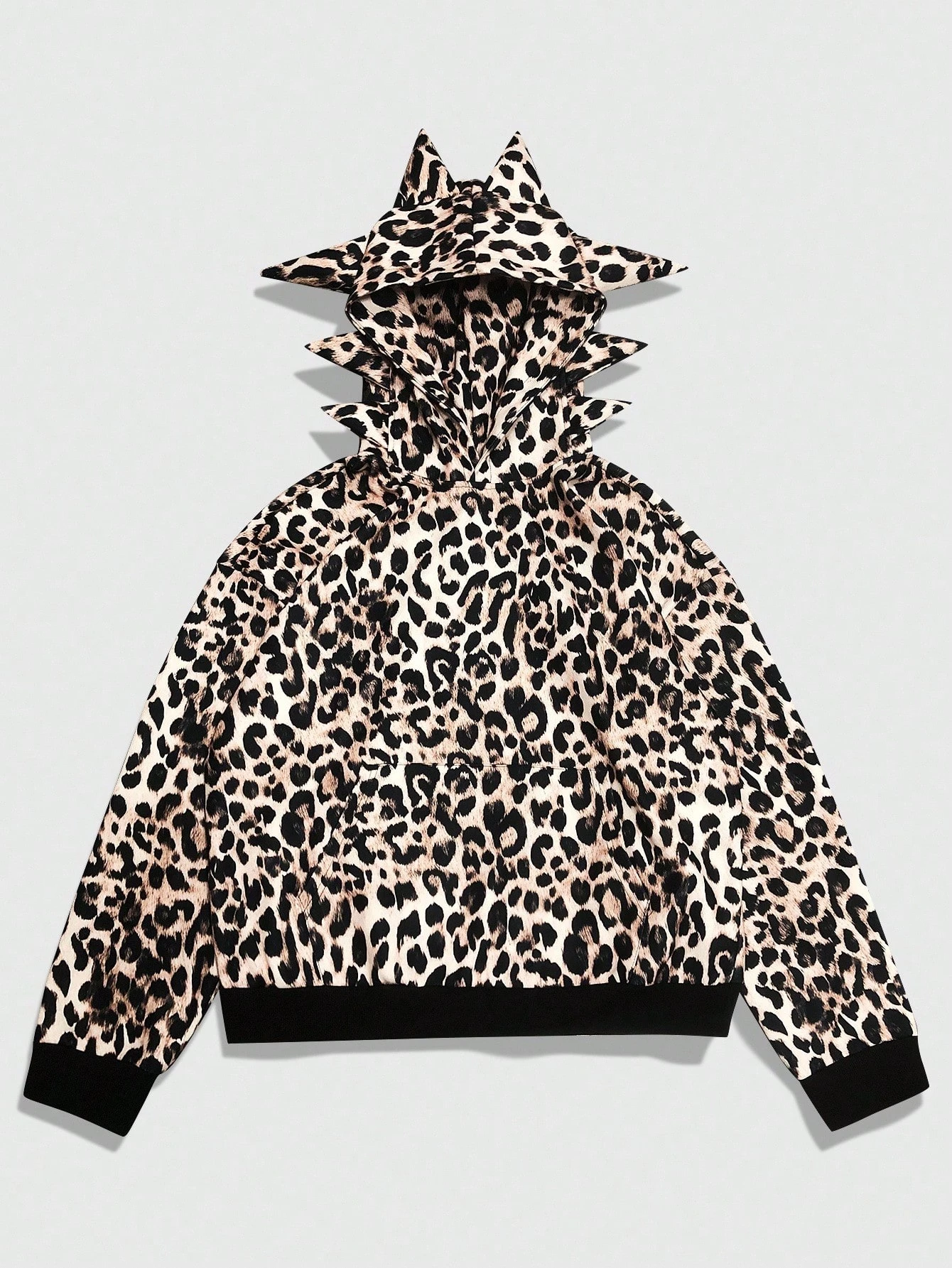 Street Life Sudadera con capucha de estilo corto y suelto con estampado de leopardo y antenas asimétricas para hombre, otoño