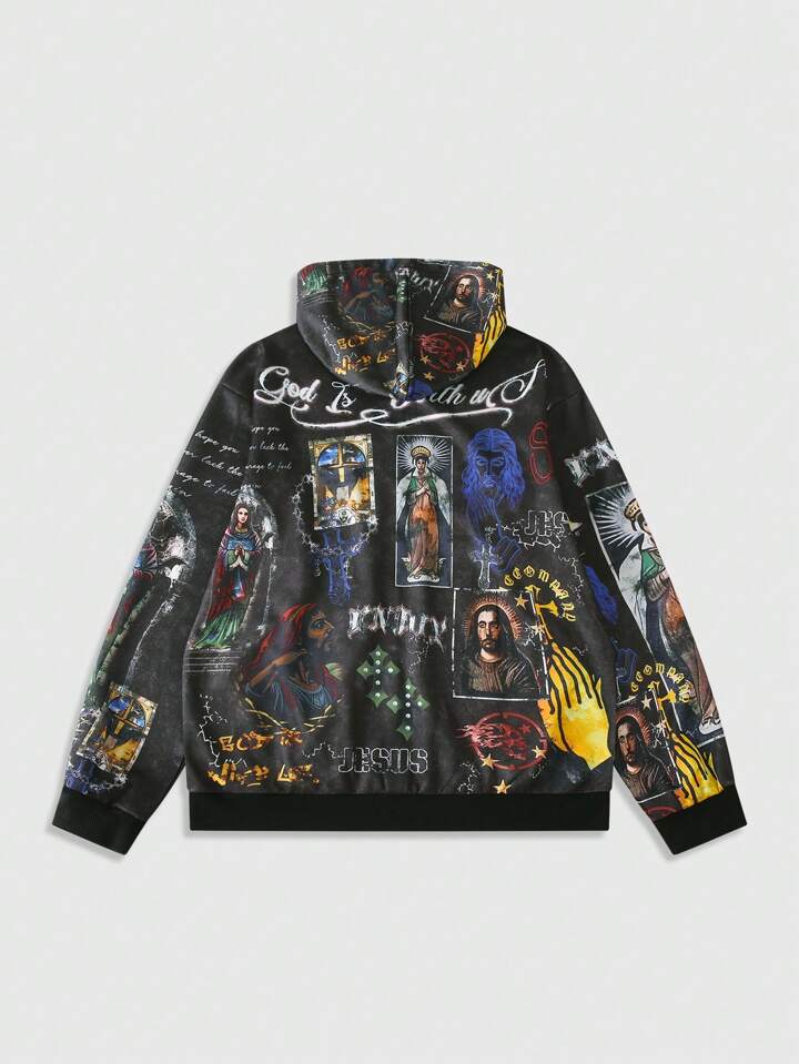 Street Life Sudadera con capucha con cremallera y estampado gráfico de letras y números, casual para hombres en otoño/invierno