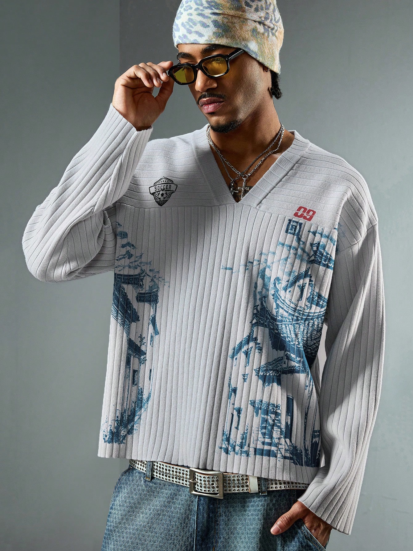 Street Life Jersey de cuello en V azul para hombres con patrón de líneas arquitectónicas