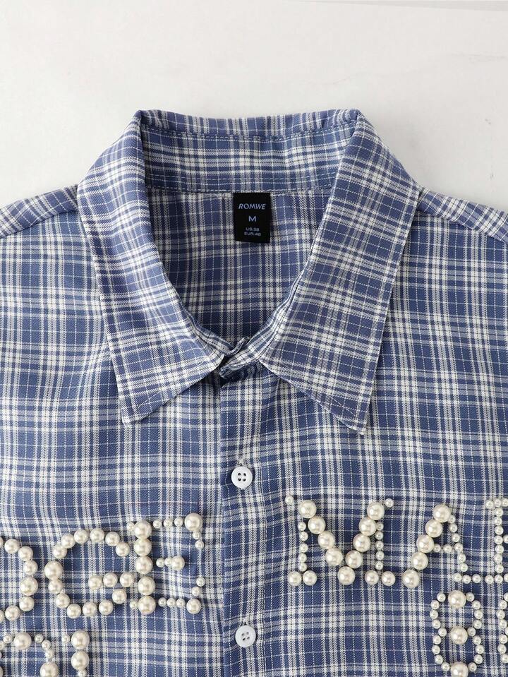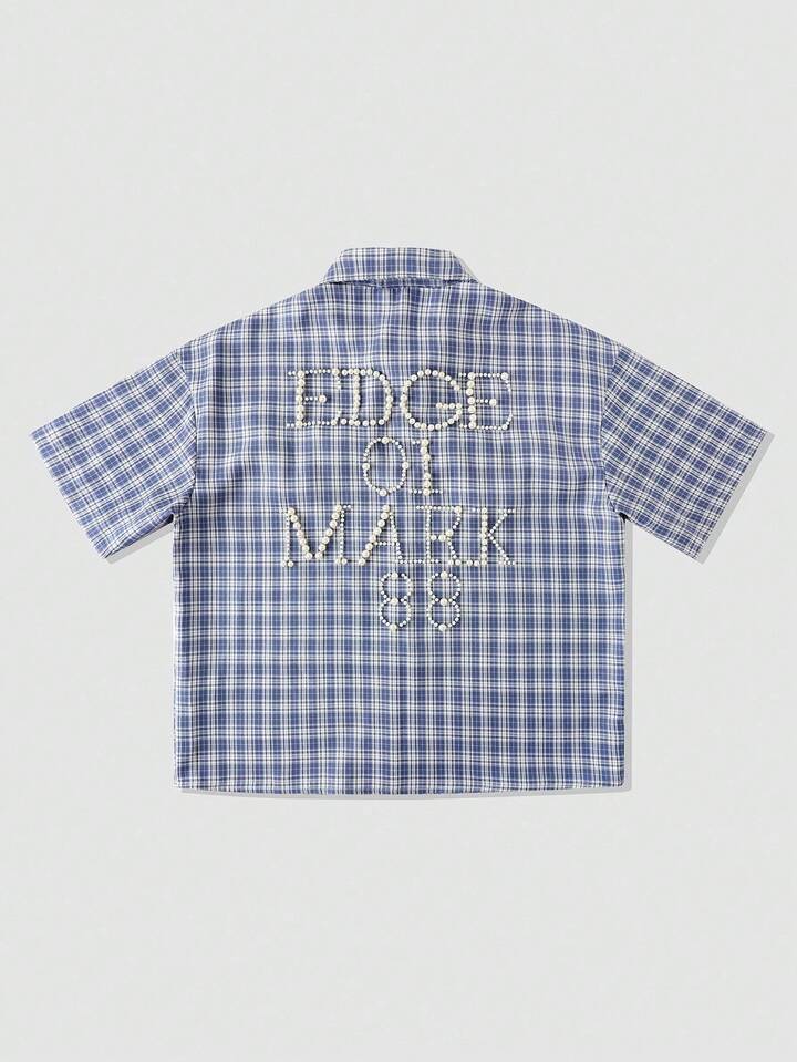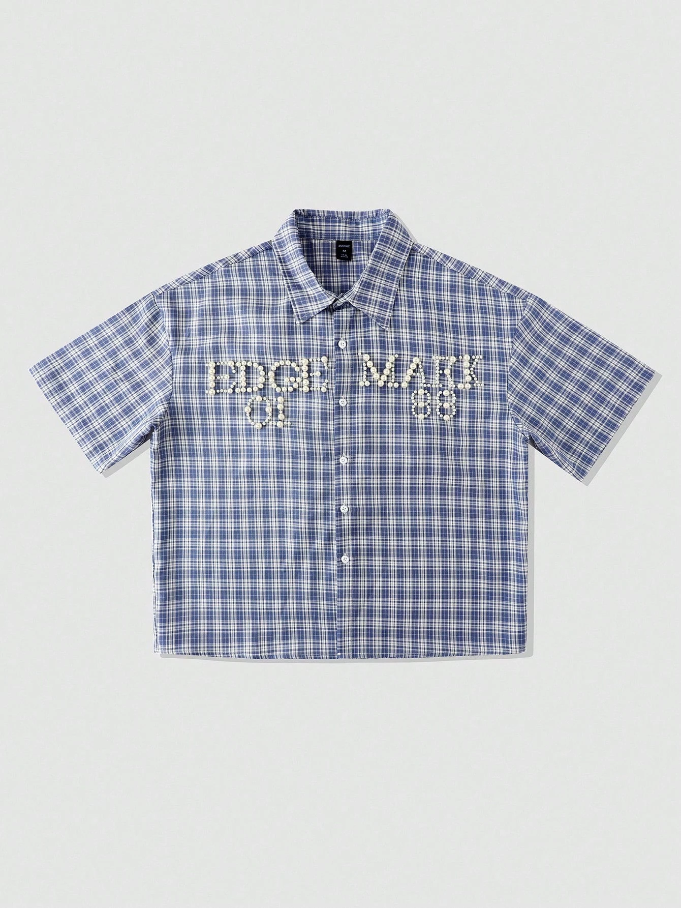 Street Life Camisa casual de manga corta con ajuste de caja, cuadros y decoración de perlas falsas para hombre
