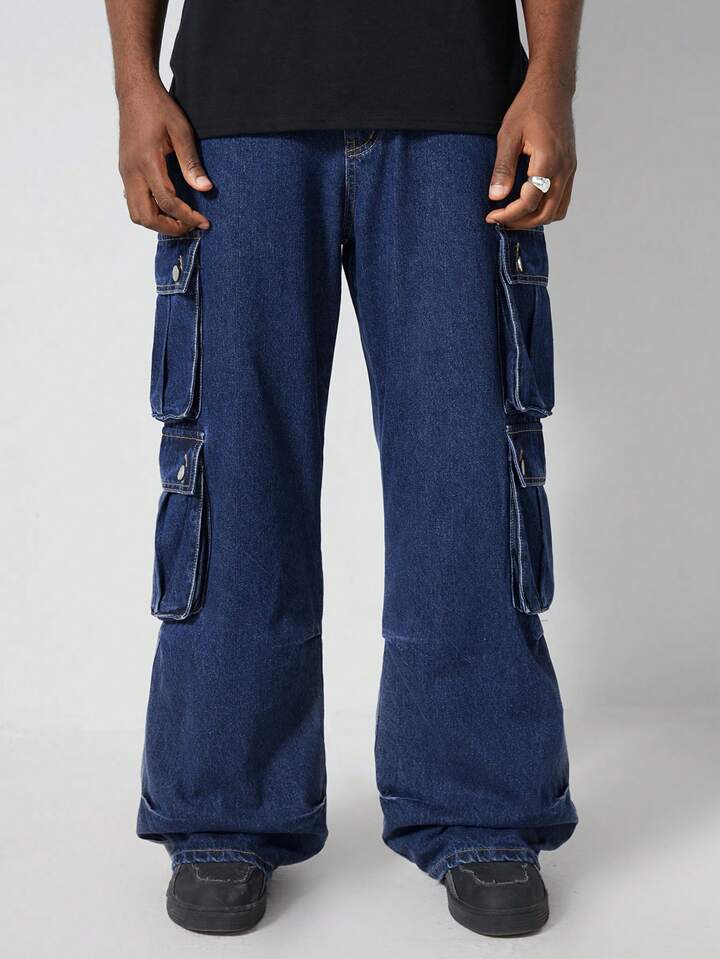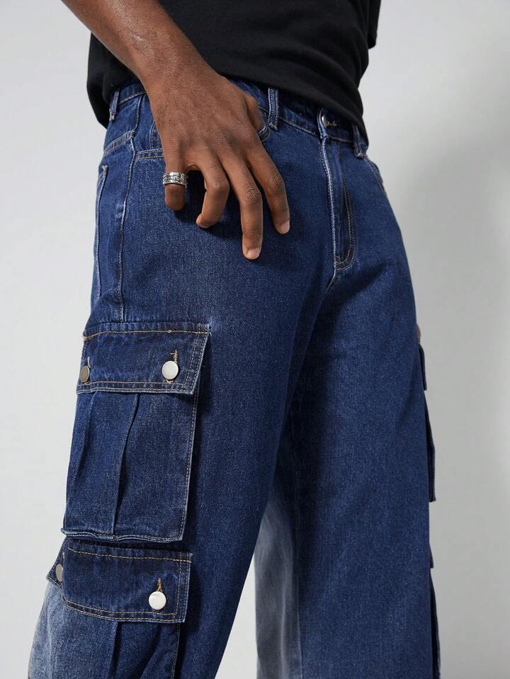 Street Life Pantalones vaqueros tipo cargo casuales de hombre con lavado, piernas anchas y bolsillos con solapa