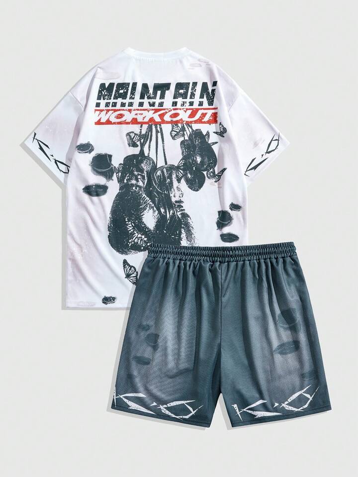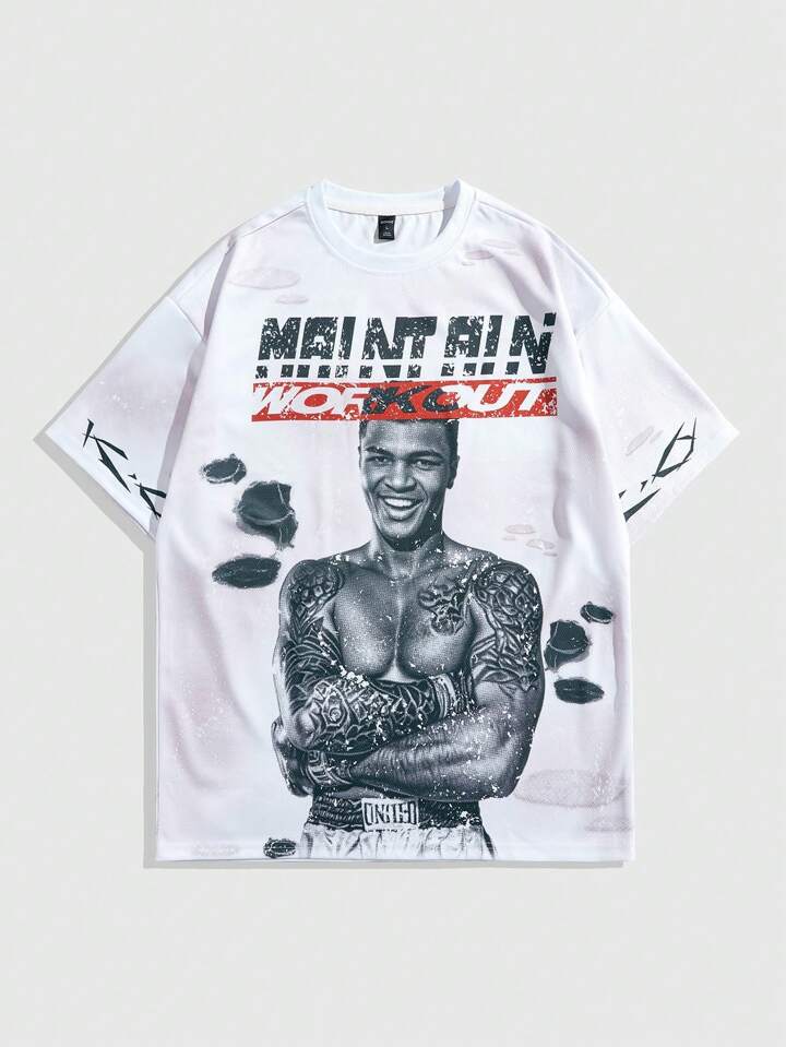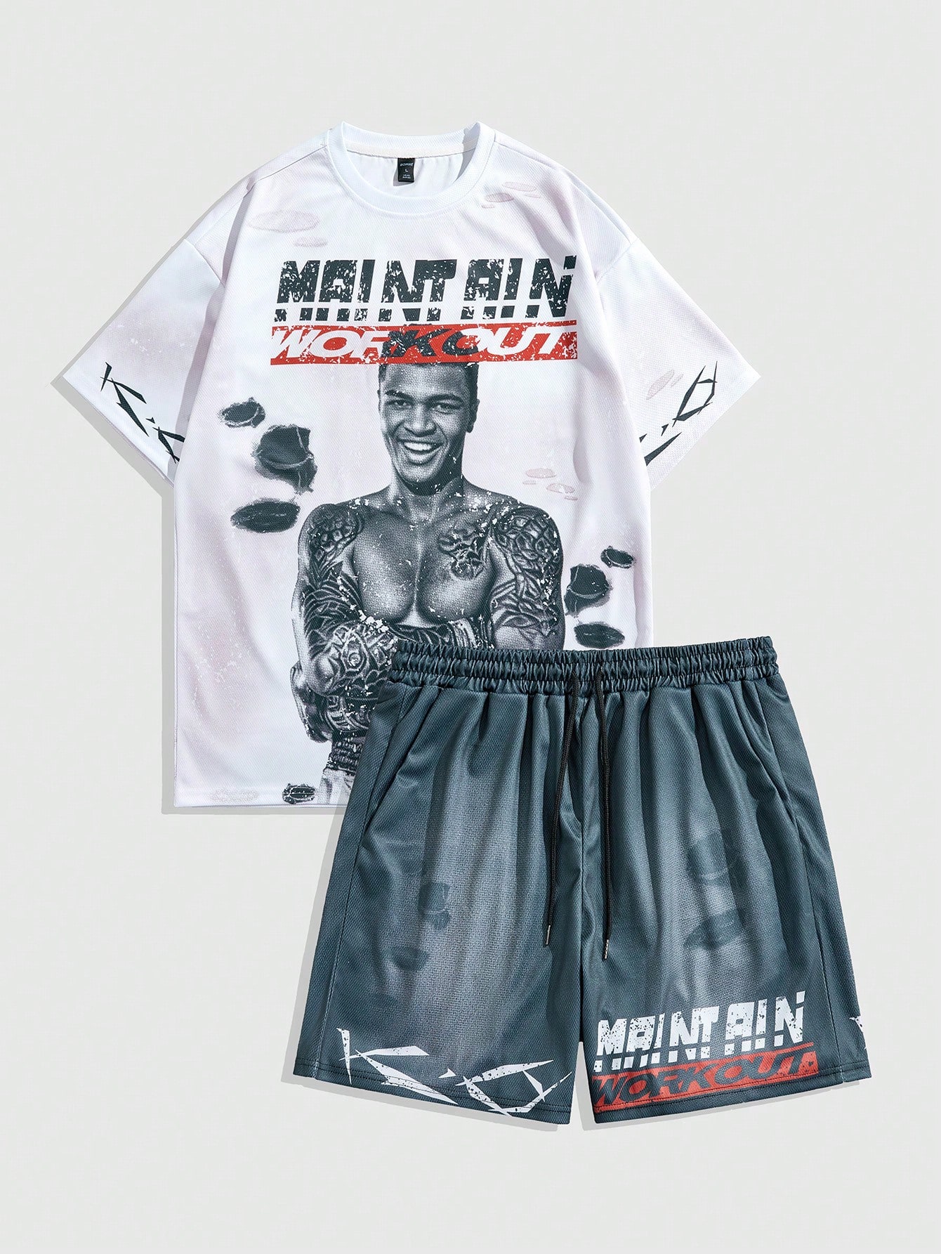 Street Life Conjunto de camiseta holgada de manga caída con estampado de personaje de boxeo casual y pantalones cortos con cordón en la cintura, para verano, para hombres