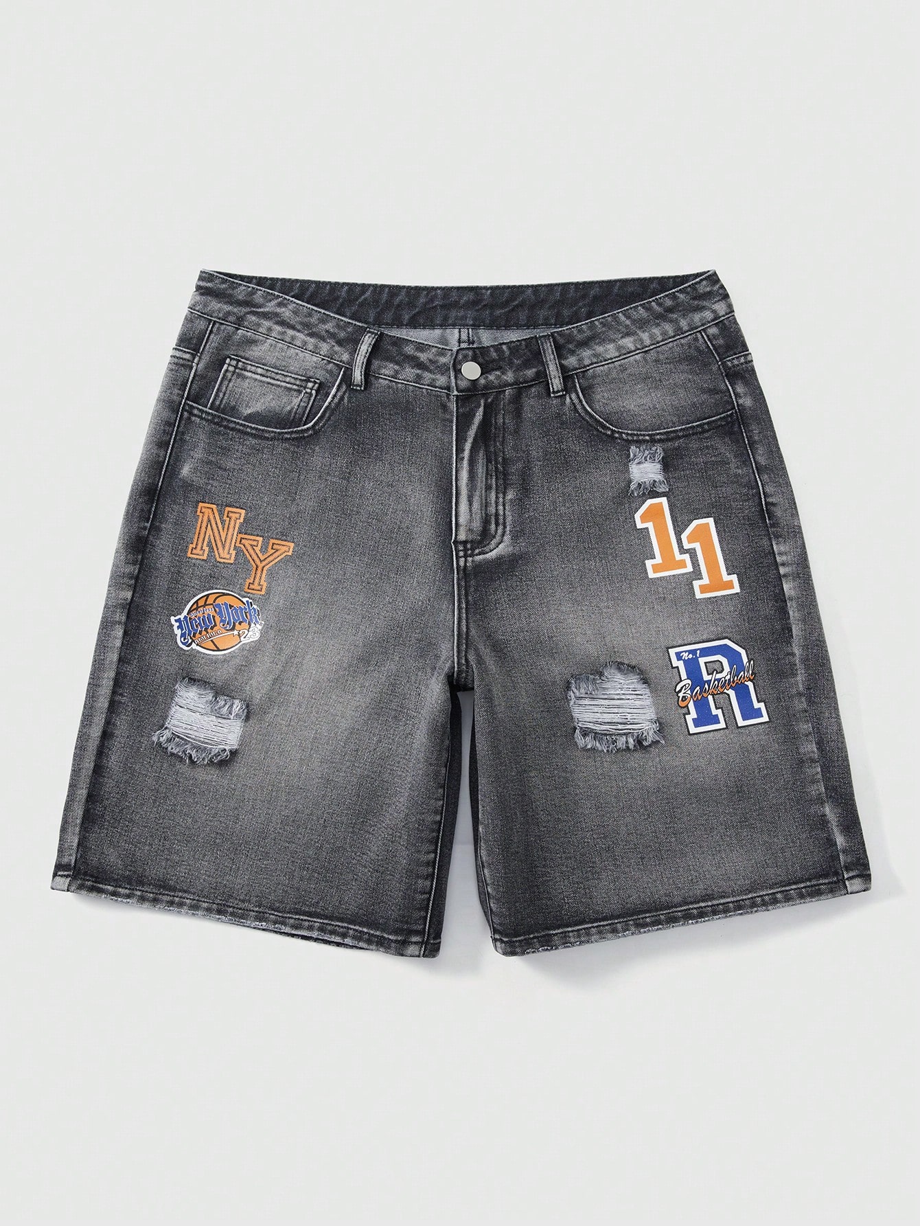 Street Life Pantalones cortos de mezclilla con estampado de letras desgastado, casual para hombre, de verano