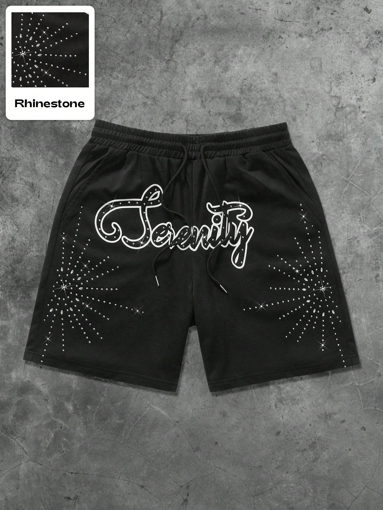 Street Life Pantalones cortos casuales de hombre con detalles de tachuelas en los costados, con diseño de impresión en inglés "Serenity" y estilo callejero estadounidense