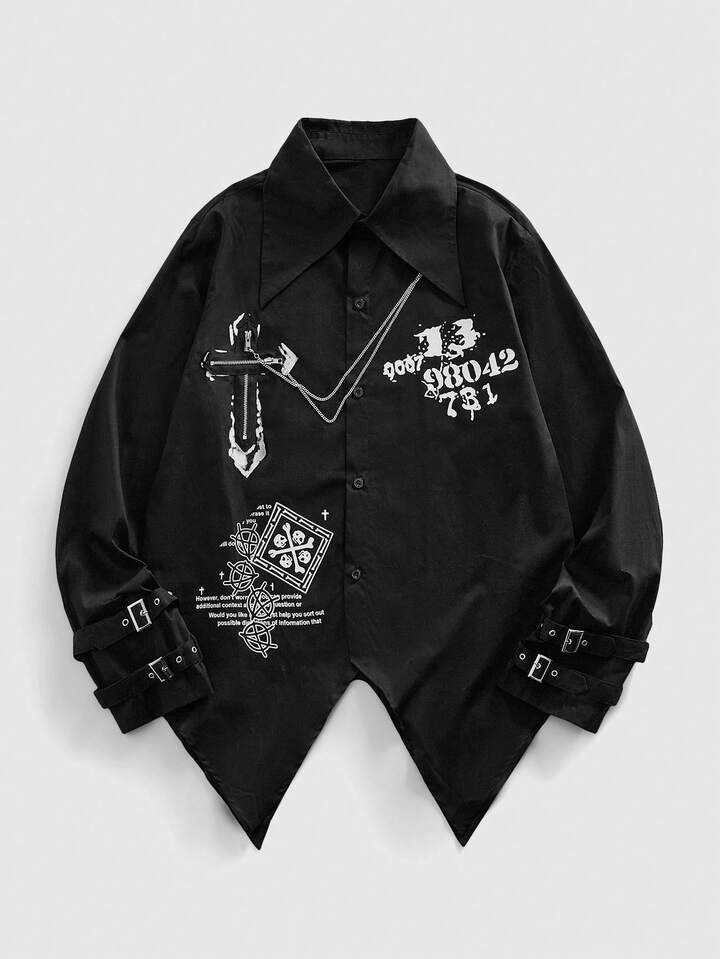 Street Life Camisa de manga larga con estampado de lema de cruz oscura, decoración de cadena y bajo asimétrico, estilo casual y punk para hombre