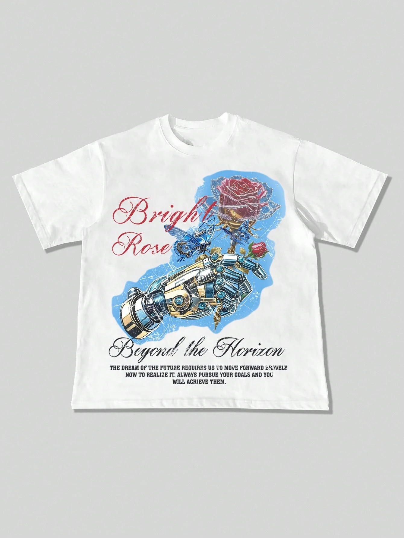 Street Life Camiseta de manga corta de cuello redondo con estampado de lema y floral, casual y versátil, para hombre