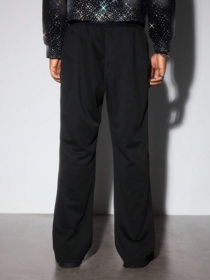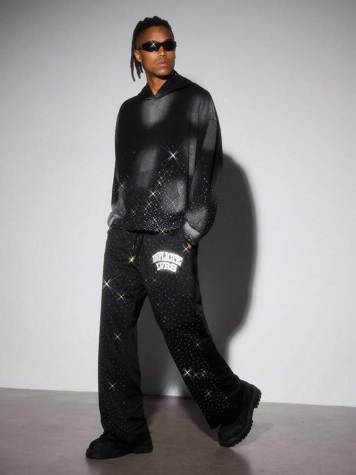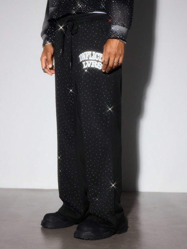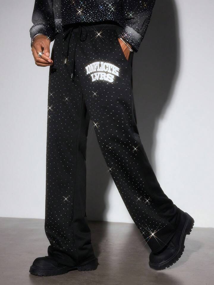 Street Life Pantalones deportivos casuales para hombres con efecto de strass y diseño de estampado en inglés, estilo callejero americano