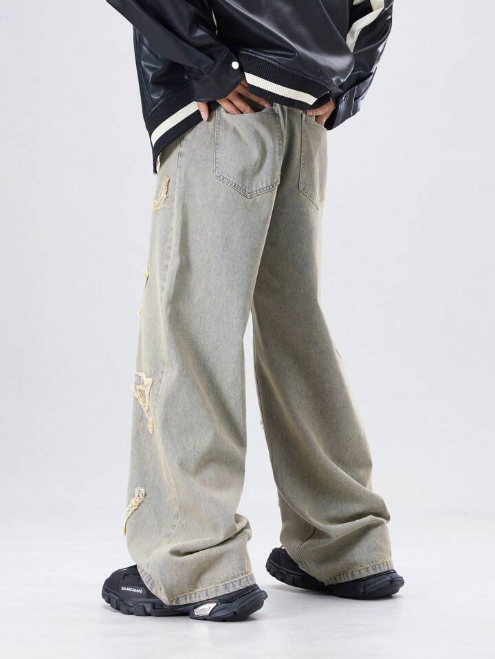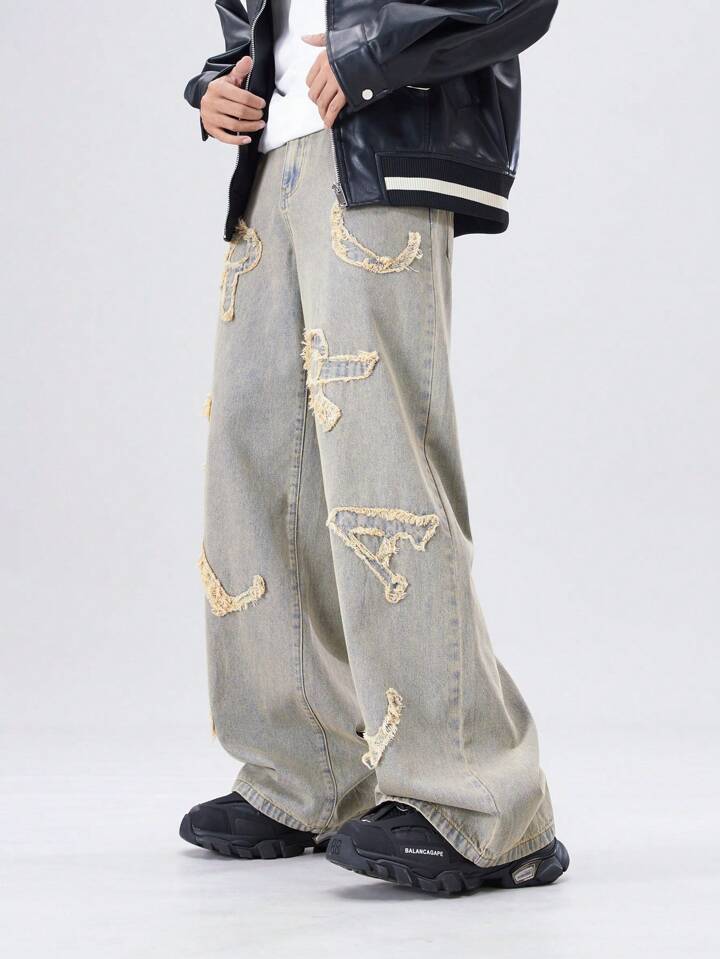 Street Life Pantalones vaqueros casuales para hombres con dobladillo deshilachado y aplicación de letra lavada