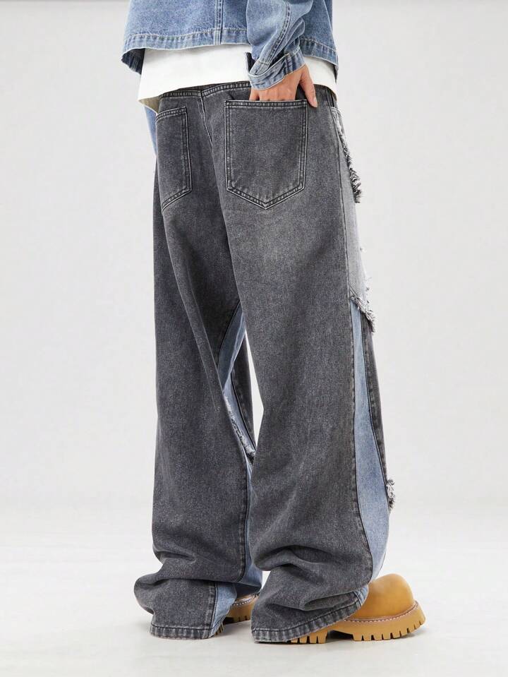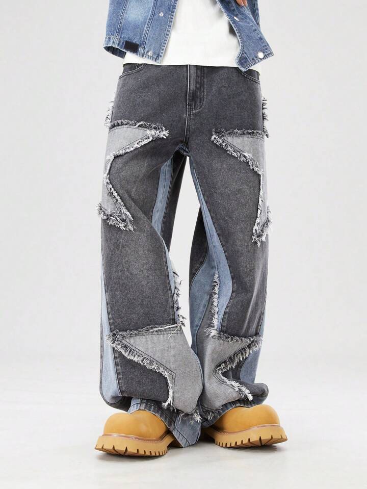 Street Life Jeans casuales para hombres con bolsillo y dobladillo deshilachado de color contrastante