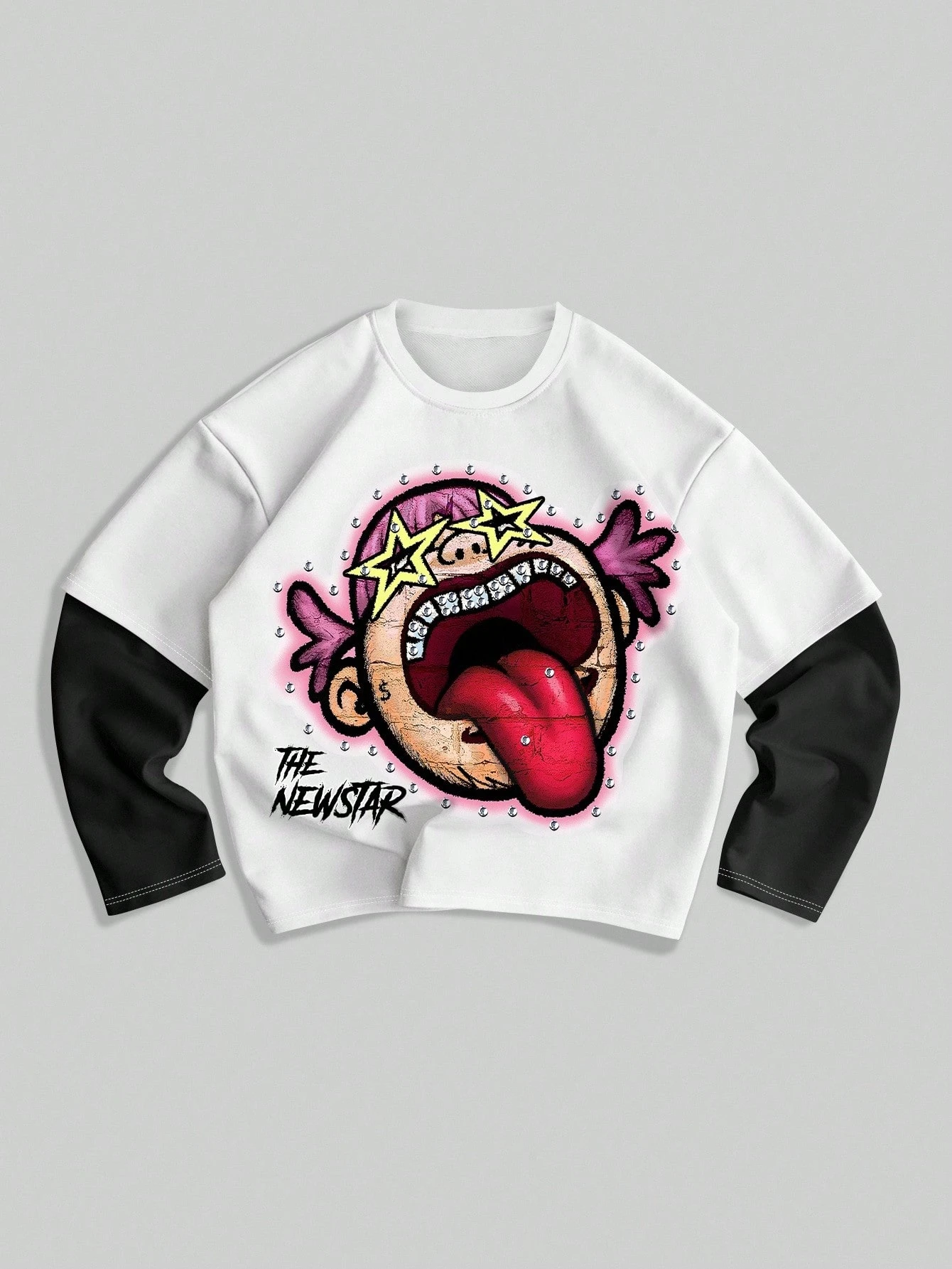 Street Life Camiseta de manga larga con estampado de parches de color contrastante y dibujos animados para hombre, otoño