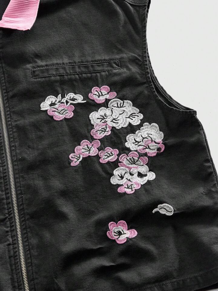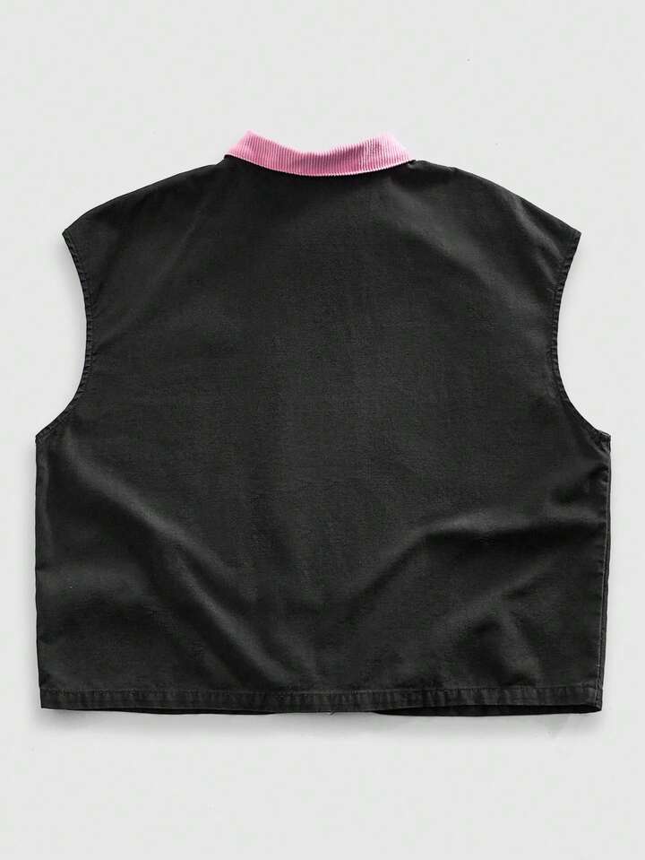 Street Life Chaqueta vaquera sin mangas con cremallera, cuello de color contrastante y parches, de moda y versátil para hombres